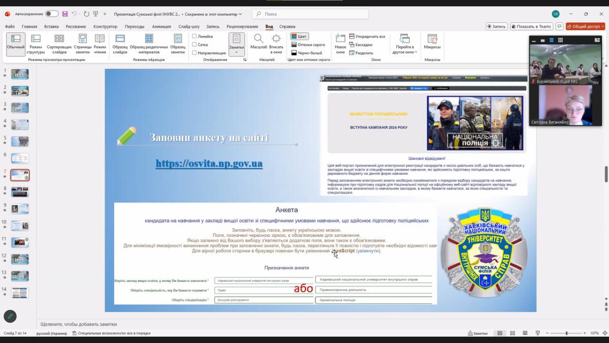 Учні 11-го класу отримали вичерпну інформацію про умови здобуття вищої освіти у Сумській філії Харківського національного університету внутрішніх справ, детально ознайомившись зі спеціальностями та освітніми програмами у сфері права та правоохоронної діяльності. Були висвітлені особливості освітнього процесу, переваги університетської підготовки, а також ключові аспекти вступу (правила, конкурсні вимоги, перелік документів). Особливу увагу приділили широким перспективам працевлаштування випускників у підрозділах Національної поліції, органах державної влади, юридичних службах та інших структурах безпекового і публічного секторів. Зустріч відбулася у форматі відкритого діалогу, що дозволило учням активно обговорити питання студентського та курсантського життя, практичної підготовки та кар'єрних можливостей.