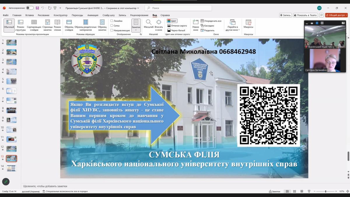 Професор кафедри соціально-економічних дисциплін Світлана Виганяйло провела профорієнтаційну зустріч з учнями 11-го класу Буринського міського ліцею № 2 імені Ю.М. Лавошника Буринської міської ради Сумської області.