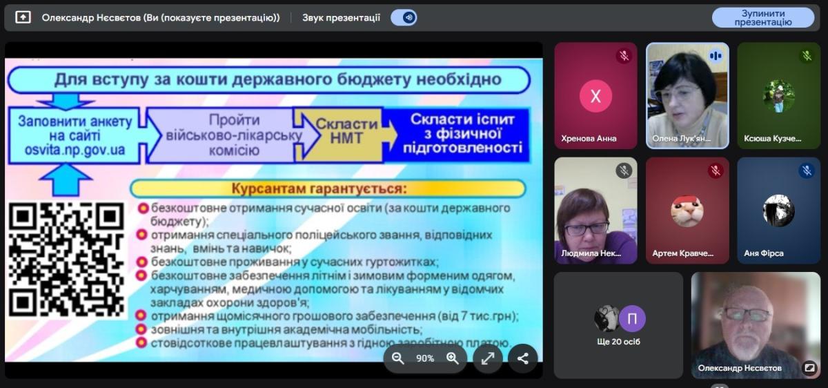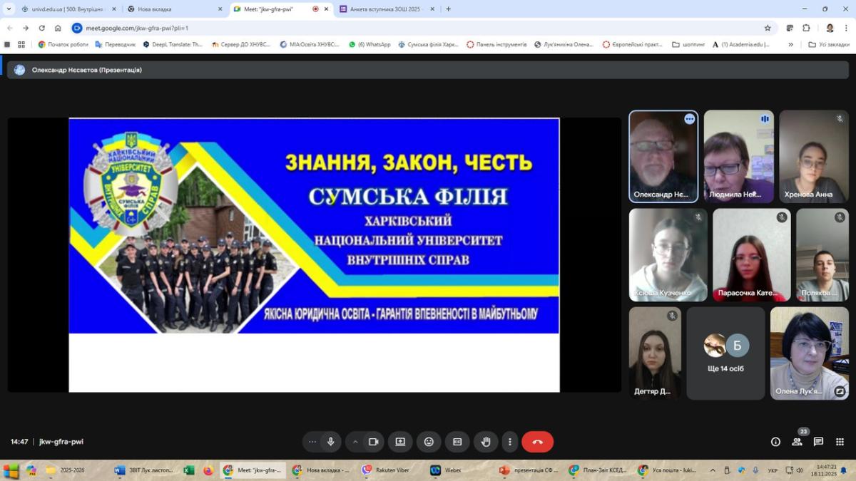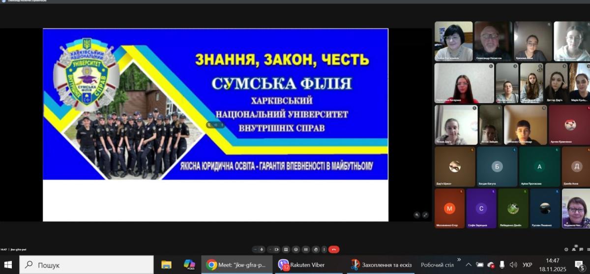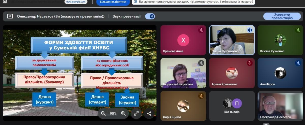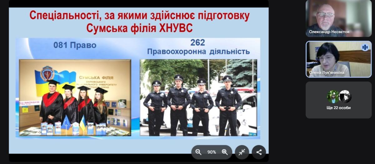 Завідувачка кафедри соціально-економічних дисциплін Олена Лук'янихіна разом зі старшим викладачем кафедри Олександром Нєсвєтовим провели профорієнтаційну онлайн-зустріч з учнями 11-го класу Глухівської загальноосвітньої школи І-ІІІ ступенів №6 Глухівської міської ради Сумської області. Вони ознайомили випускників з умовами вступу на спеціальності «Право» та «Правоохоронна діяльність».