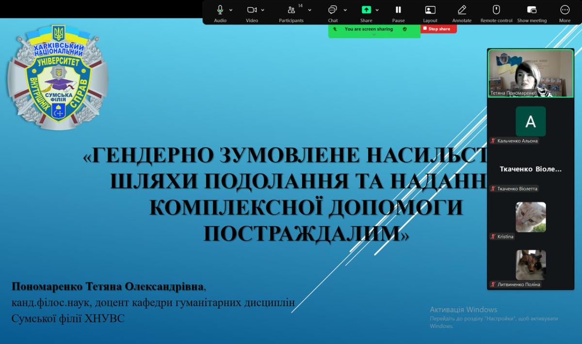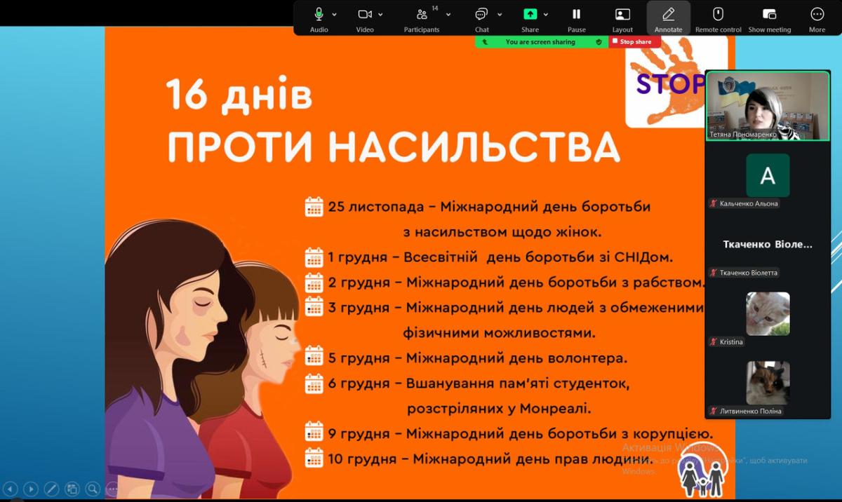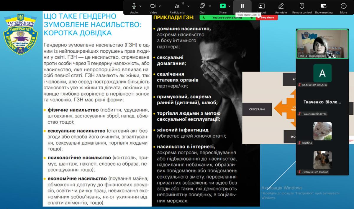Для здобувачів загальної середньої освіти Заводського ліцею Кириківської селищної ради доцентом кафедри гуманітарних дисциплін Сумської філії ХНУВС Тетяною Пономаренко організовано і проведено правоосвітній захід «Гендерно зумовлене насильство: шляхи подолання та надання комплексної допомоги постраждалим» в межах акції «16 днів проти насильства», яка покликана привернути увагу громадськості до проблем подолання насильства в сім’ї, жорстокого поводження з дітьми та захисту прав людини.