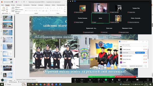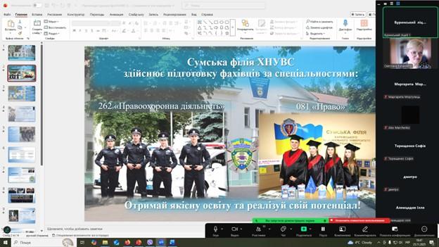 Майбутнім абітурієнтам було презентовано всі аспекти вступу до Сумської філії Харківського національного університету внутрішніх справ. Обговорювались умови отримання ступеня «бакалавр» на базі повної середньої освіти, зокрема, можливості бюджетного та контрактного навчання.