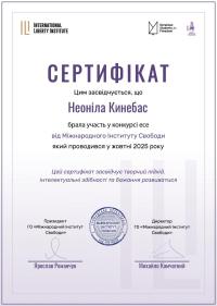 Студентка 1-го курсу Неоніла Кинебас отримала перший позитивний досвід участі у Конкурсі Есе для студентів, аспірантів та молодих науковців 2025 року від ГО «Міжнародний Інститут Свободи», який відбувся у жовтні 2025 року.