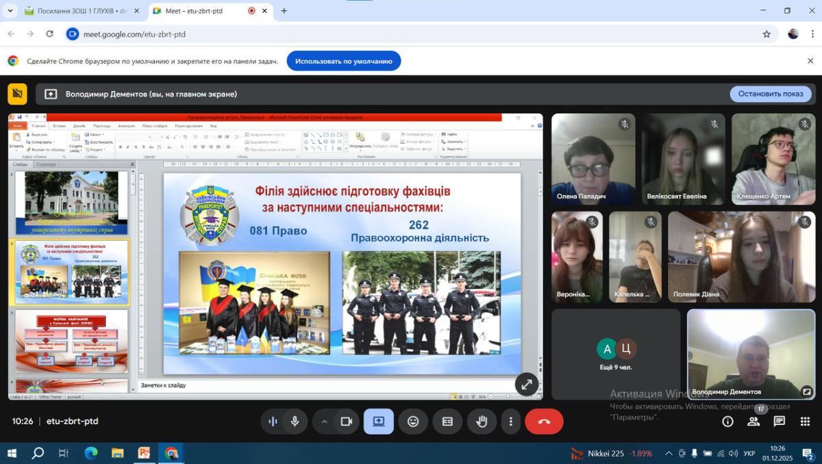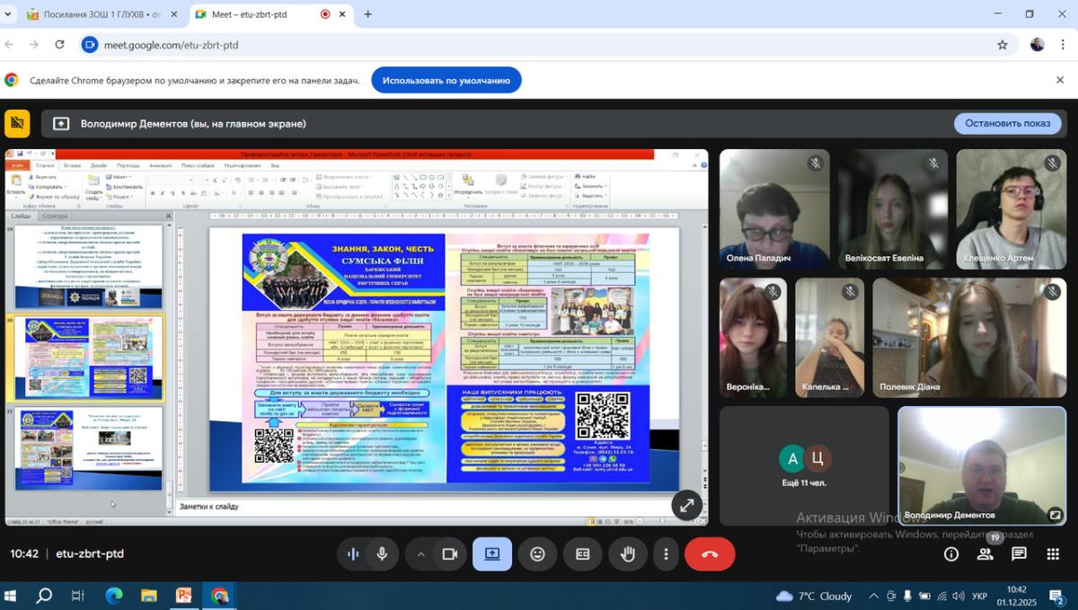 Доцент кафедри соціально-економічних дисциплін Володимир Дементов організував та провів в онлайн форматі профорієнтаційну зустріч з учнями 11-го класу Глухівської загальноосвітньої школи І-ІІІ ступенів №1 Глухівської міської ради Сумської області.
