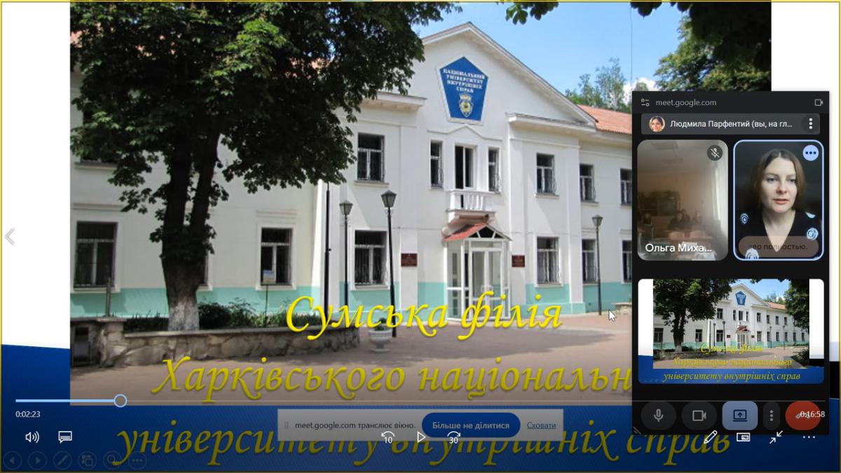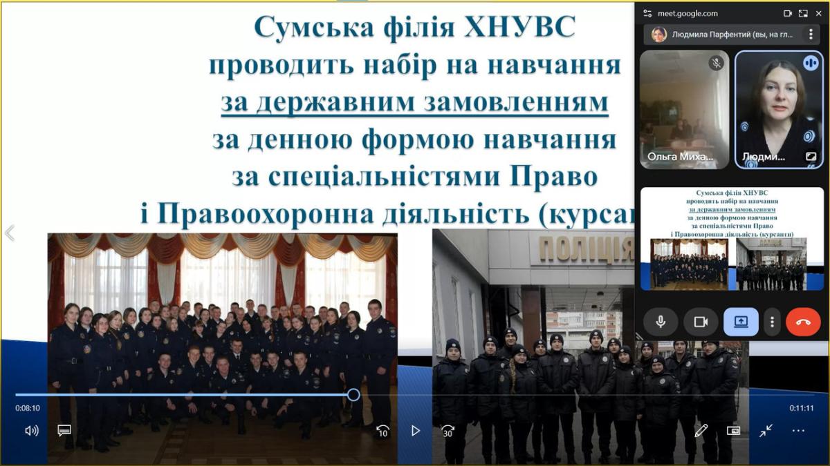 Доцентка кафедри соціально-економічних дисциплін Сумської філії Харківського національного університету внутрішніх справ, кандидатка економічних наук Людмила Парфентій провела профорієнтаційну онлайн-зустріч з учнями 11 класу Козацького ЗЗСО на платформі Meet. Під час спілкування вона ознайомила випускників з перспективами юридичної освіти в Україні, особливостями роботи нотаріусів, прокурорів, суддів, адвокатів, юрисконсультів і поліцейських, а також окреслила можливості працевлаштування осіб з юридичною освітою. Окрім цього, школярі отримали інформацію про умови вступу та особливості навчання у Сумській філії ХНУВС.