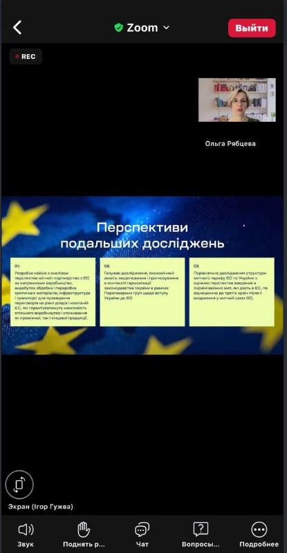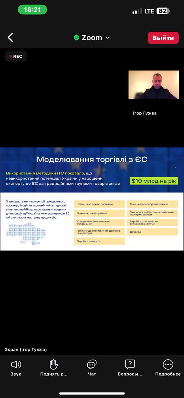 В рамках заходу студенти мали нагоду ознайомитись зі змістовною презентацією та отримати ґрунтовні фахові відповіді на актуальні питання сьогодення, про те, як євроінтеграція України приносить взаємну економічну вигоду Україні та ЄС; які програми та інструменти ЄС відкривають можливості для українського бізнесу, реформ і відновлення; як ефективно використовувати ці інструменти для модернізації економіки та інтеграції у внутрішній ринок ЄС, а також долучитись до обговорення запропонованих висновків та рекомендацій, зокрема щодо наступних кроків по реалізації можливостей з точки зору практичної інтеграції до ринку ЄС і ресурсів для відновлення української економіки.