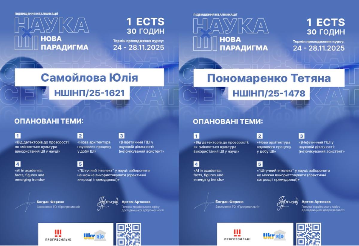 Завідувачка кафедри гуманітарних дисциплін Сумської філії ХНУВС Юлія Самойлова та доцент Тетяна Пономаренко успішно пройшли курс підвищення кваліфікації «Наука ✕ ШІ: нова парадигма», організований ГО «Прогресильні», метою якого було ознайомлення освітян із трансформаційними процесами, які привносять новітні технології у сферу академічних досліджень.