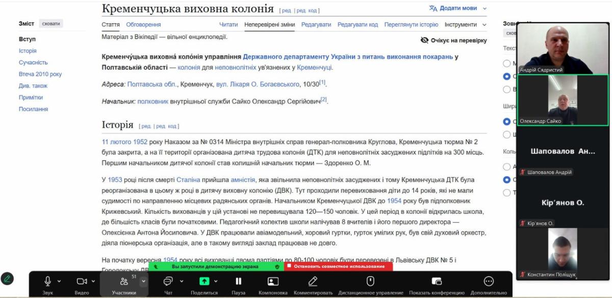 Під час заняття було розглянуто правові засади функціонування виховних колоній, їх місце в системі органів і установ виконання покарань, а також особливості правового статусу неповнолітніх засуджених. Олександр Сайко поділився практичним досвідом роботи у виховній колонії, звернув увагу на питання соціально-виховної та психологічної роботи з вихованцями, підготовки їх до звільнення та подальшої ресоціалізації.