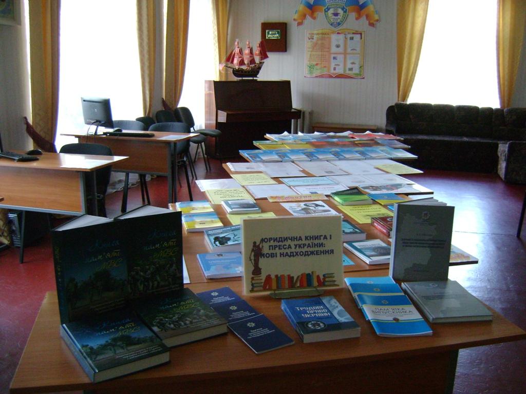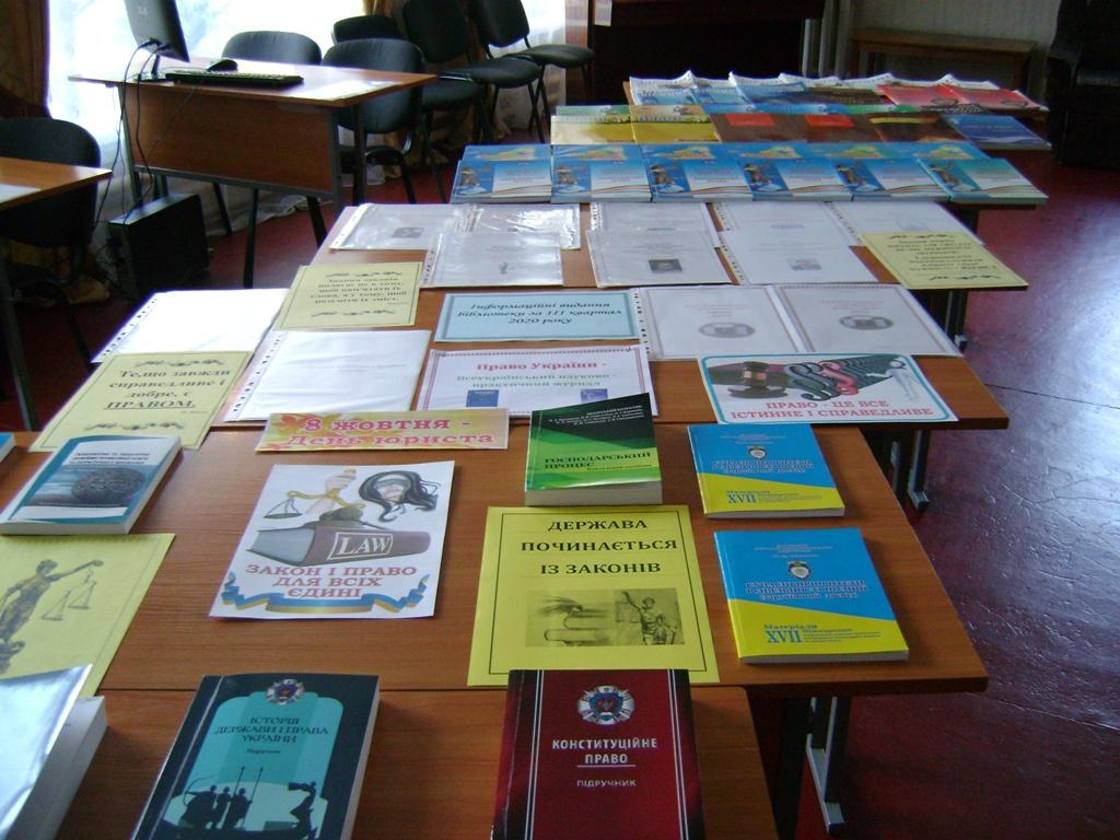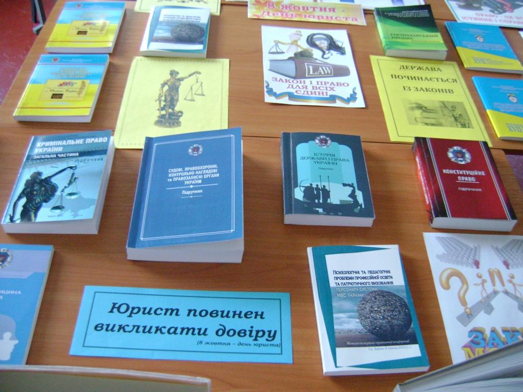 З нагоди свята бібліотека підготувала тематичний День інформації «Юридична книга і преса України: нові надходження», де представлено літературу з різних галузей права: міжнародне, кримінальне, адміністративне, конституційне, трудове, судова медицина та психіатрія, господарський процес та ін. Викладчам, студентам та курсантам буде цікаво познайомитися з підручниками, посібниками, матеріалами науково-практичних конференцій з проблем професійної освіти та патріотичного виховання персоналу системи МВС України, матеріалами міжнародних студентських науково-практичних конференцій (деякі з них іноземними мовами), тезами доповідей круглих столів.
