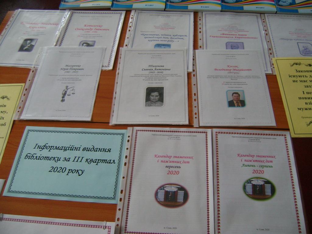 На допомогу навчальному процесу та самоосвіті стануть в нагоді інформаційно-бібліографічні матеріали (підсумок за ІІІ кв.): інформаційний вісник «По сторінках періодичних видань», календарі знаменних і памятних дат, тематичний список літератури «Правова культура в професії юриста», експрес-інформація з циклів: «Вчені-правознавці - ювіляри 2020 року» та «Краєзнавство - як збереження культурного насліддя краю».