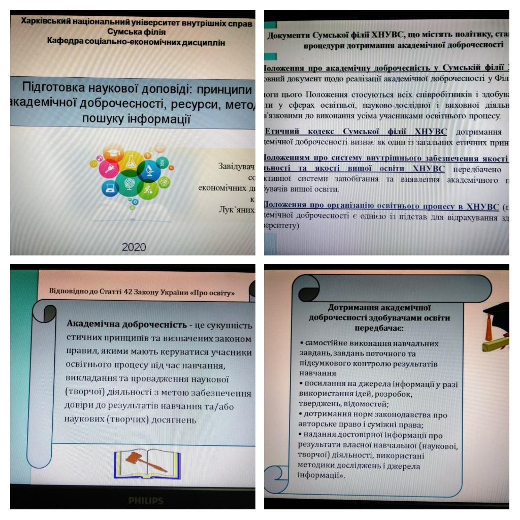 Доповідач зупинилась на основних видах порушень академічної доброчесності та видах відповідальності здобувачів вищої освіти за її порушення. Присутніх було ознайомлено з основними документами Сумської філії ХНУВС, що містять політику, стандарти і процедури дотримання академічної доброчесності.