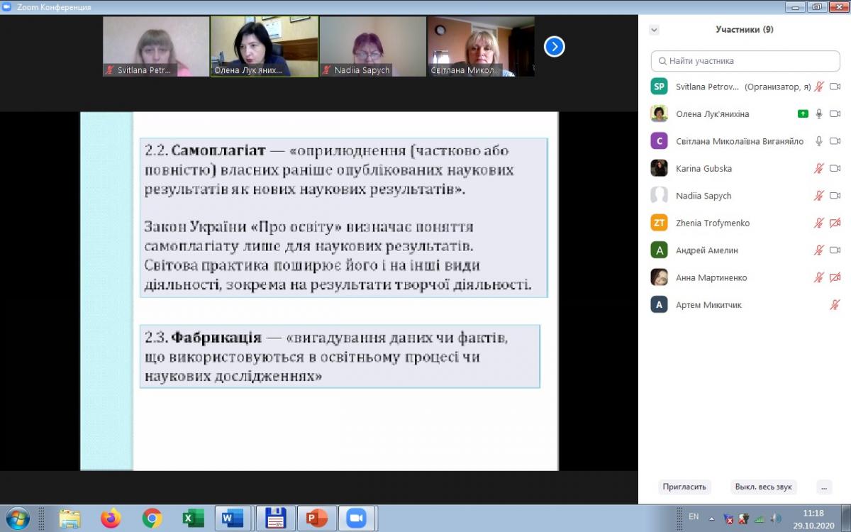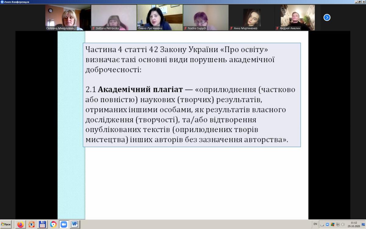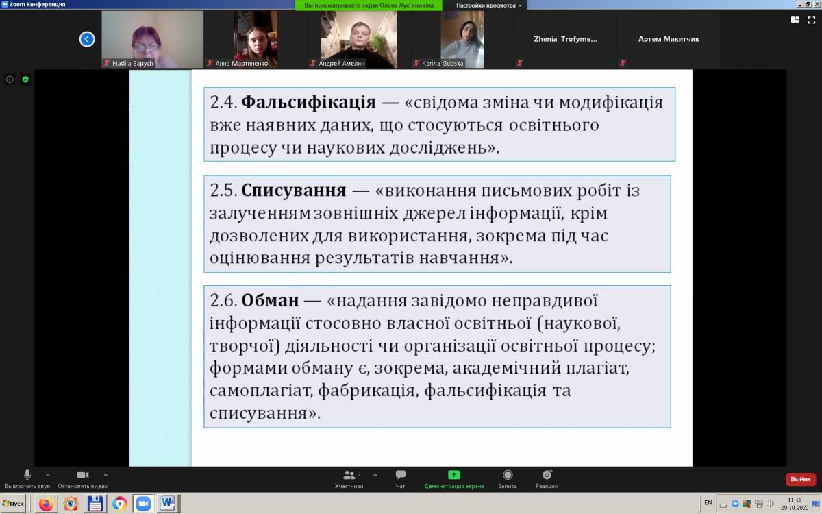 У першій частині доповіді Олена Анатоліївна ознайомила гуртківців і нагадала присутнім викладачам про сутність академічної доброчесності в цілому, і що саме передбачає дотримання її принципів педагогічними, науково-педагогічними та науковими працівниками з одного боку, і здобувачами вищої освіти – з іншого.
