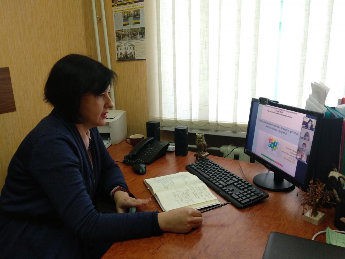 Друга частина доповіді була присвячена основним підходам до підготовки наукової доповіді. Олена Анатоліївна наголосила на необхідності дотримання доброчесної поведінки здобувачем вищої освіти як у рамках освітнього процесу, так і наукової діяльності, ознайомила присутніх із основними науковими ресурсами та методами пошуку інформації для підготовки наукового повідомлення.