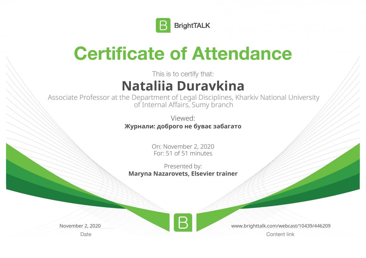 Доцент кафедри юридичних дисциплін Сумської філії ХНУВС Наталія Дуравкіна стала учасником вебінару, який проводила офіційний тренер компанії Elsevier, головний бібліотекар Наукової бібліотеки ім. М. Максимовича Київського національного університету імені Тараса Шевченка Марина Назаровець.