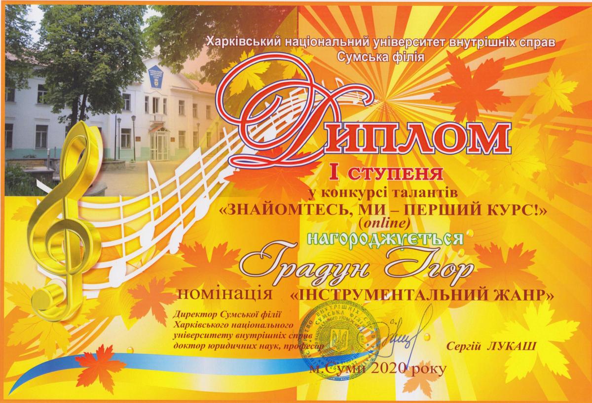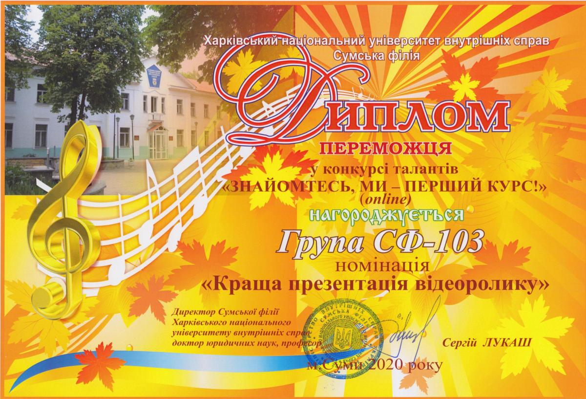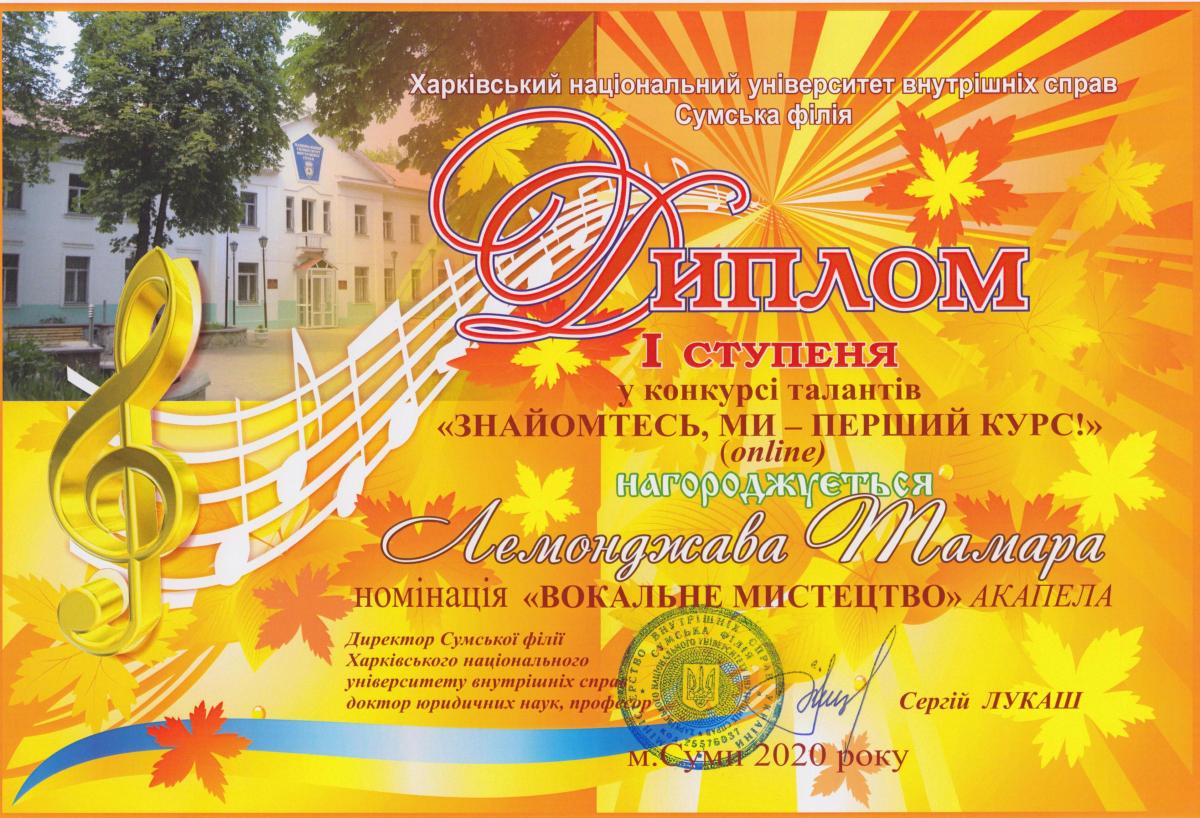 Представляємо дипломантів 1 ступеня: «Краща презентація відеоролику» - група СФ-103; «Кращий ведучий» - курсант Сіроштан Микола, група СФ-103; «Хореографічне мистецтво» та «Художнє слово» - курсант Аушева Анна, група СФ-103; «Інструментальний жанр» - курсанти Білокобиленко Семен, група СФ-103, та Градун Ігор, група СФ-104; «Вокальне мистецтво» (соло) – студентка Бикова Тетяна, група СФПДдср-20-2, та (акапела) студентка Лемонджава Тамара, група СФПДдср-20-1; «Вокал під власний супровід» - курсант Савадян Андрій, група СФ-102; «Образотворче мистецтво» - курсант Шевцова Єлизавета, група СФ-104.