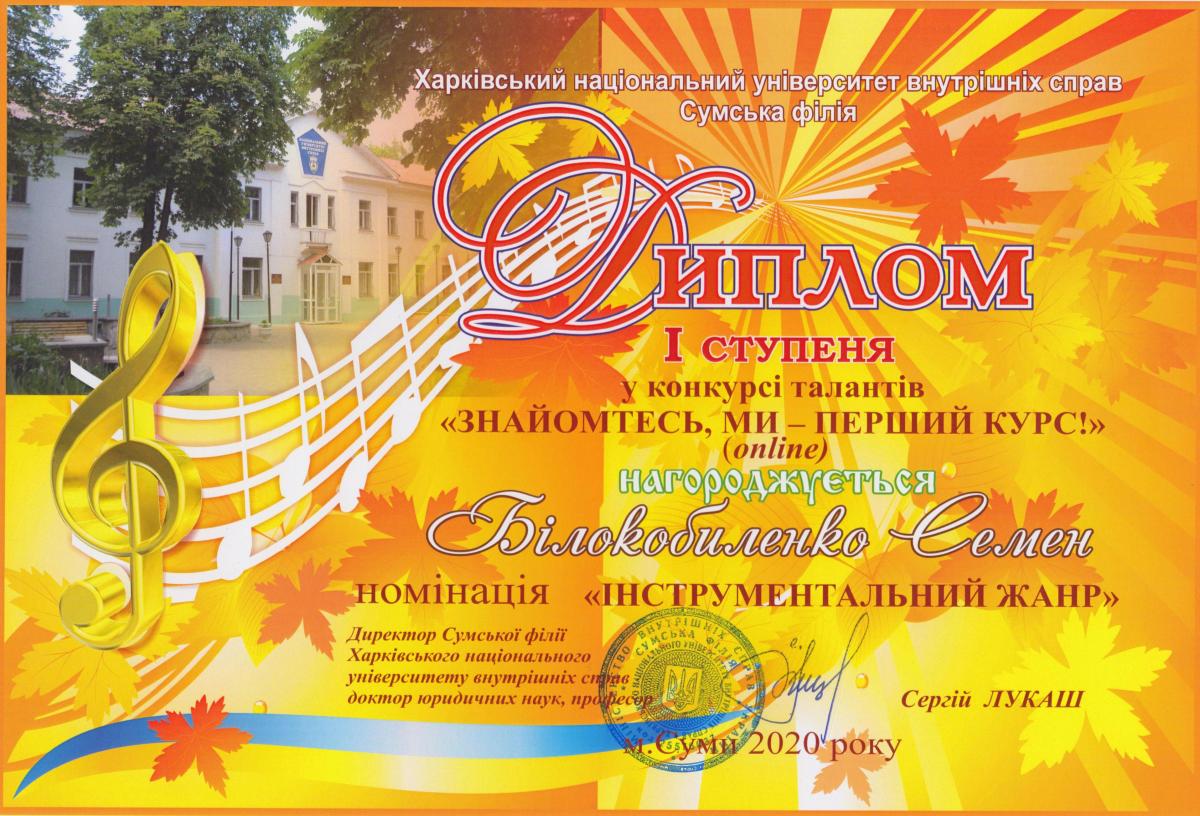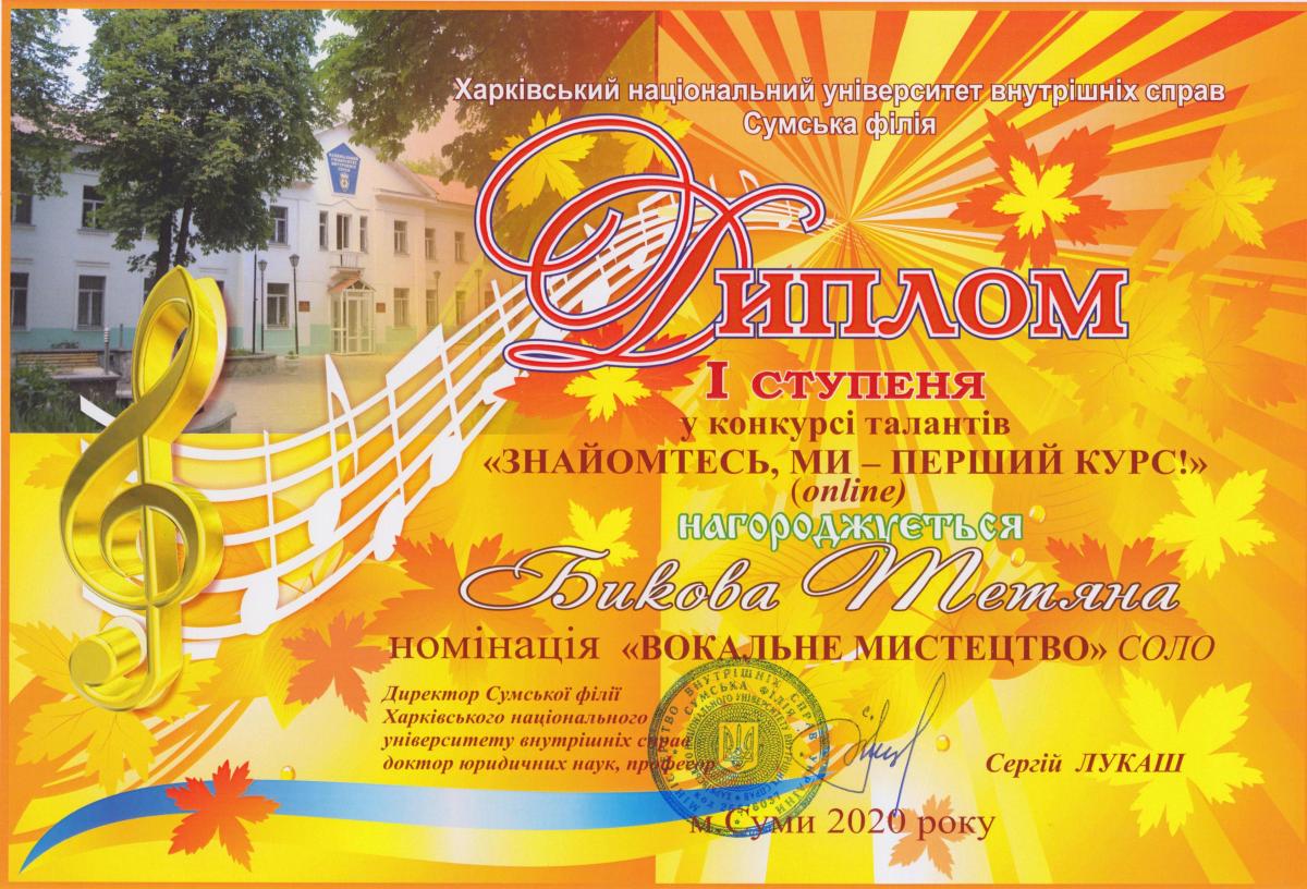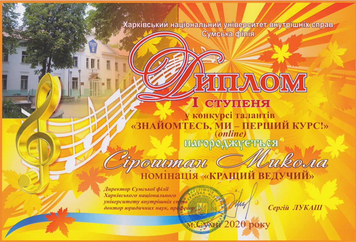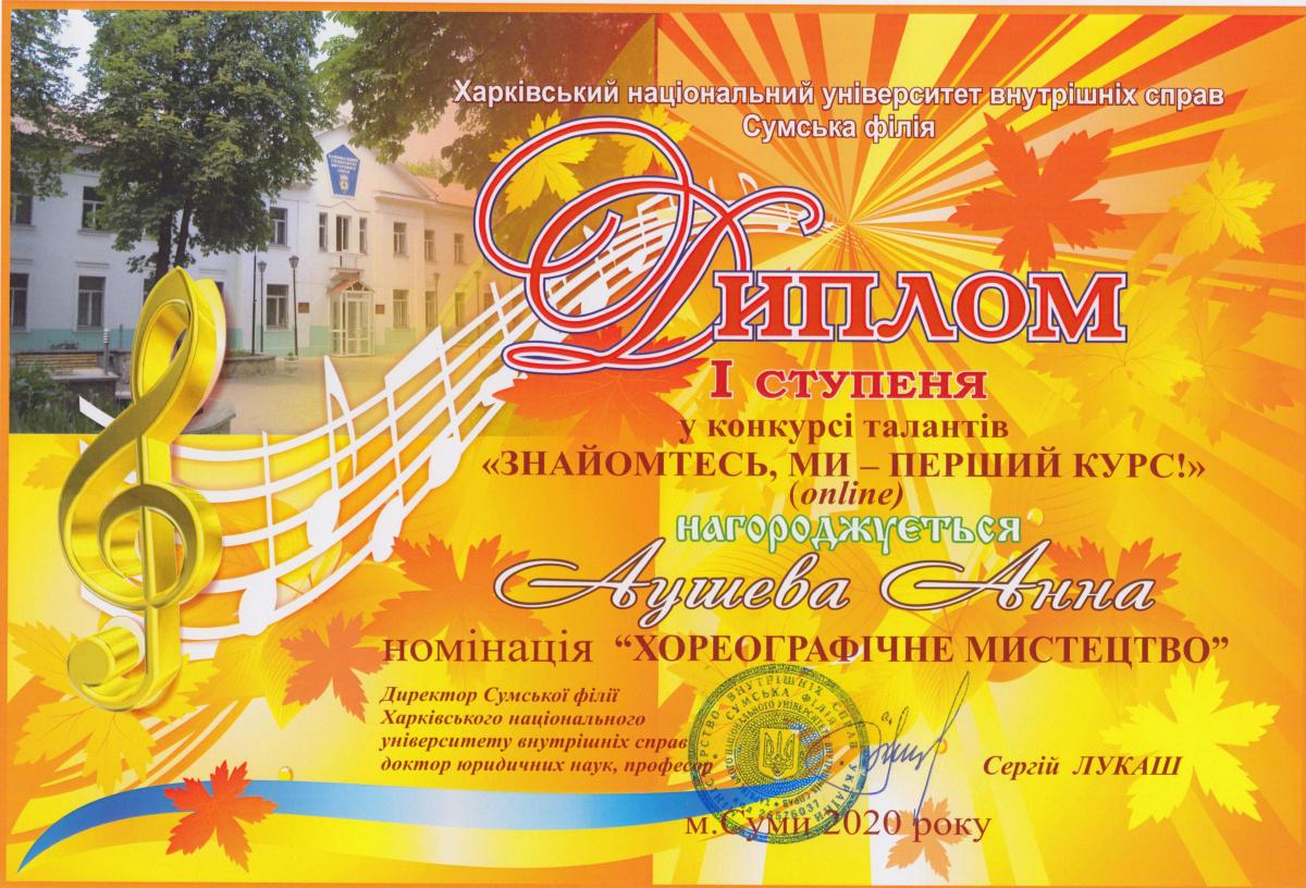 Представляємо дипломантів 1 ступеня: «Краща презентація відеоролику» - група СФ-103; «Кращий ведучий» - курсант Сіроштан Микола, група СФ-103; «Хореографічне мистецтво» та «Художнє слово» - курсант Аушева Анна, група СФ-103; «Інструментальний жанр» - курсанти Білокобиленко Семен, група СФ-103, та Градун Ігор, група СФ-104; «Вокальне мистецтво» (соло) – студентка Бикова Тетяна, група СФПДдср-20-2, та (акапела) студентка Лемонджава Тамара, група СФПДдср-20-1; «Вокал під власний супровід» - курсант Савадян Андрій, група СФ-102; «Образотворче мистецтво» - курсант Шевцова Єлизавета, група СФ-104.