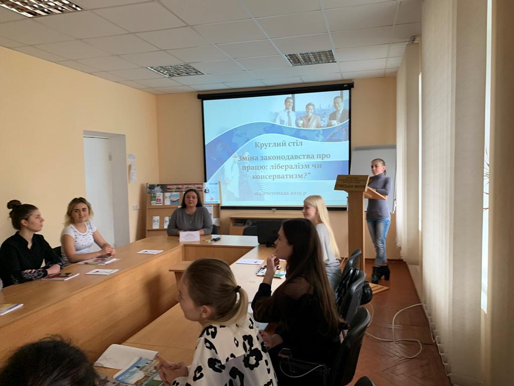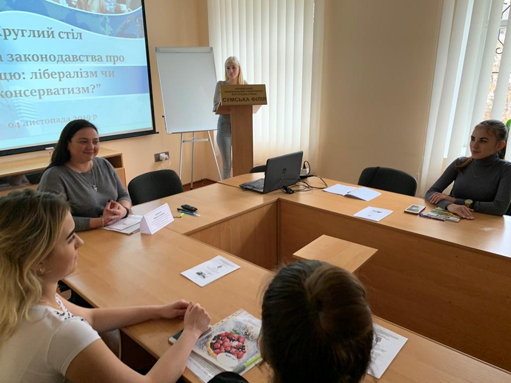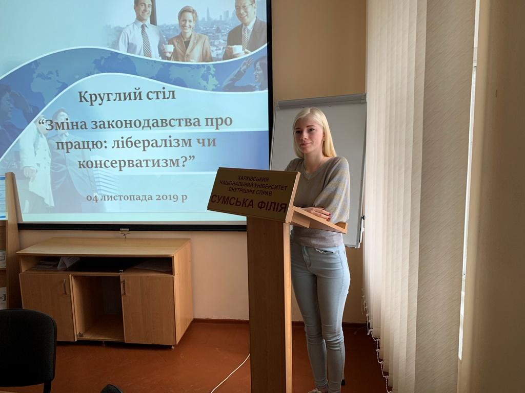 На базі Сумської філії Харківського національного університету внутрішніх справ відбувся круглий стіл «Зміна законодавства про працю: лібералізм чи консерватизм?», який був організований завідувачем кафедри юридичних дисциплін Оксаною Володимирівною Панасюк, доцентом цієї ж кафедри Наталією Ігорівною Дуравкіною та студентами-гуртківцями наукового студентського гуртка «Трудового, аграрного, земельного адміністративного, господарського та фінансового права».
