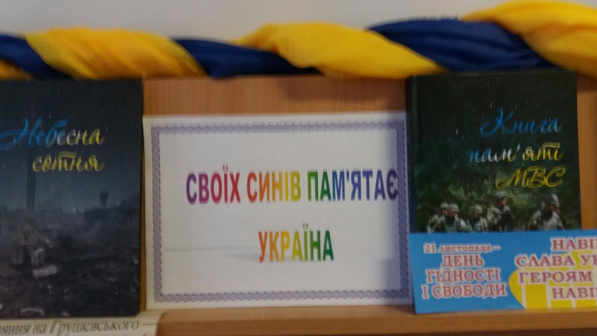 Готуючись до відзначення Дня Гідності та Свободи, в бібліотеці філії розгорнуто виставку – присвяту « Своїх синів пам'ятає Україна». Видання з виставки розповідають про героїв і перебіг Революції Гідності, що пробудила в душі кожного українця потяг до свободи та волі.