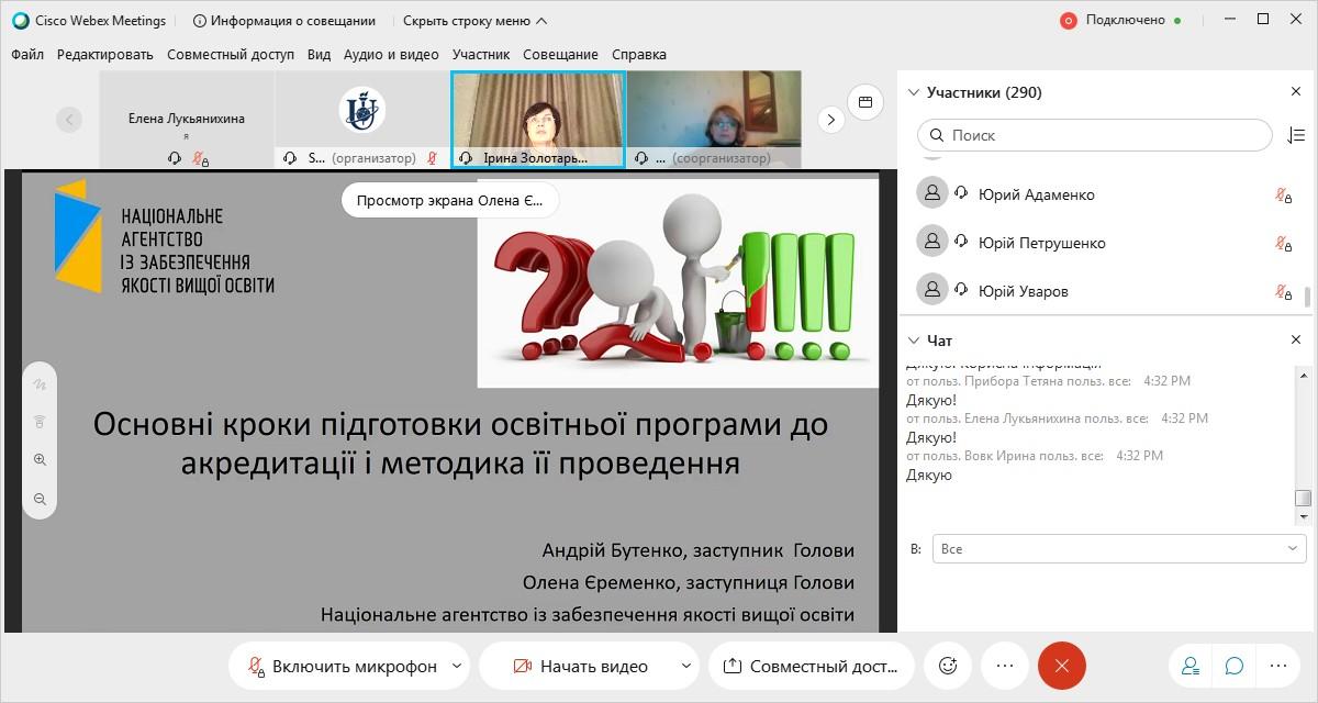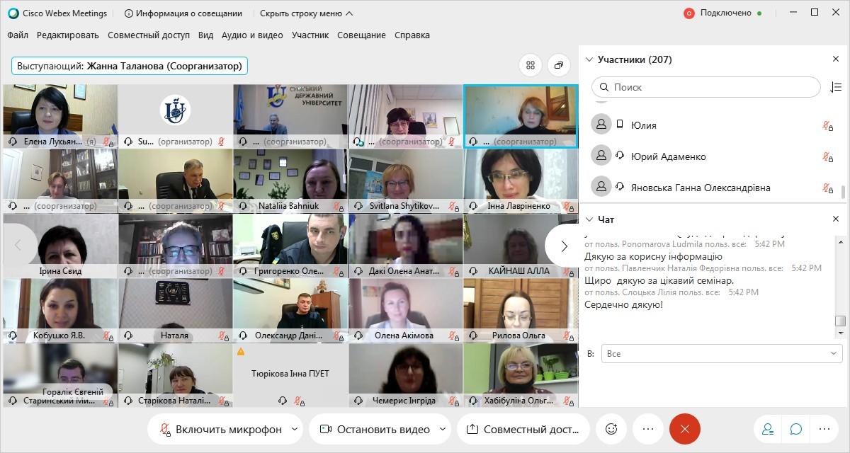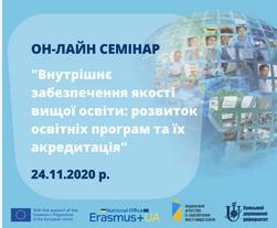 24 листопада 2020 року завідувач кафедри соціально-економічних дисциплін Сумської філії ХНУВС Олена Лук’янихіна взяла участь в онлайн-семінарі «Внутрішнє забезпечення якості вищої освіти: розвиток освітніх програм та їх акредитація», котрий проводився на онлайн-WebEx платформі.