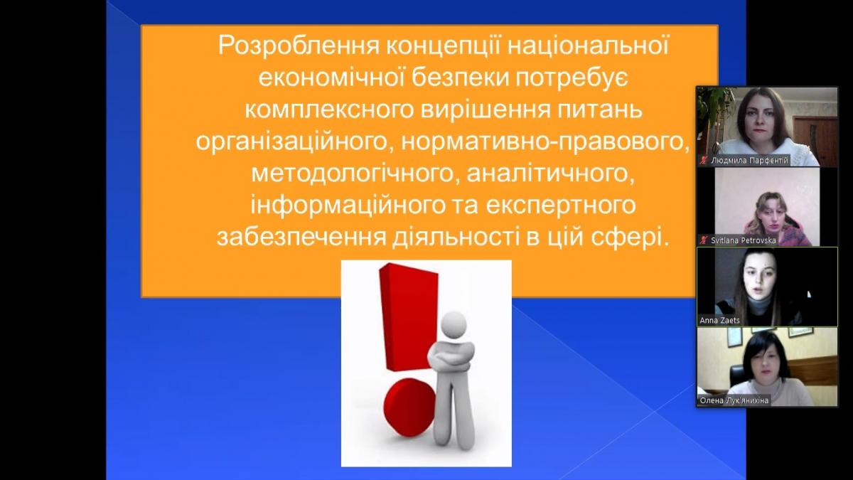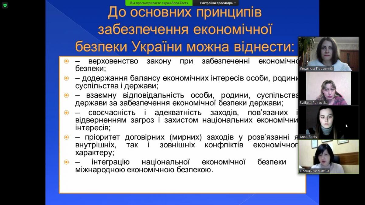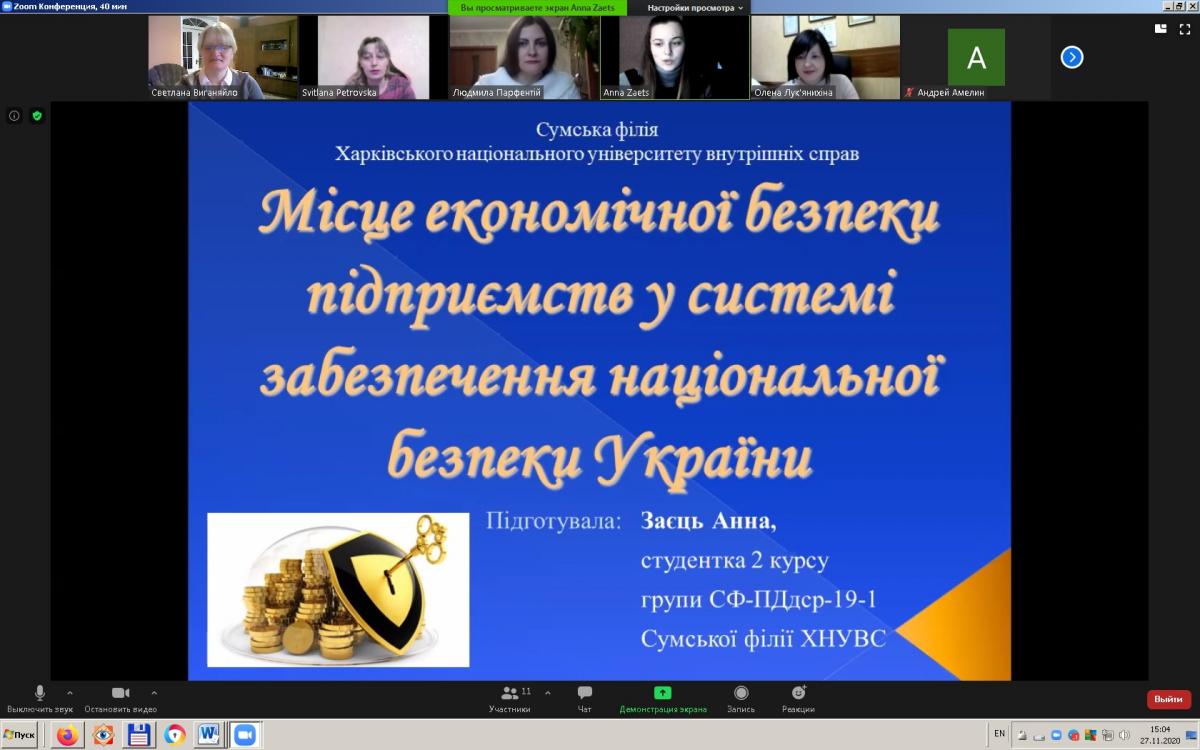 Із вступним словом до студентів-гуртківців звернулася керівник гуртка к.е.н. Петровська Світлана Анатоліївна, після чого з доповіддю на тему «Місце економічної безпеки підприємств у системі забезпечення національної безпеки України» виступила студентка 2 курсу Заєць Анна (науковий керівник – к.е.н. Парфентій Людмила Анатоліївна).