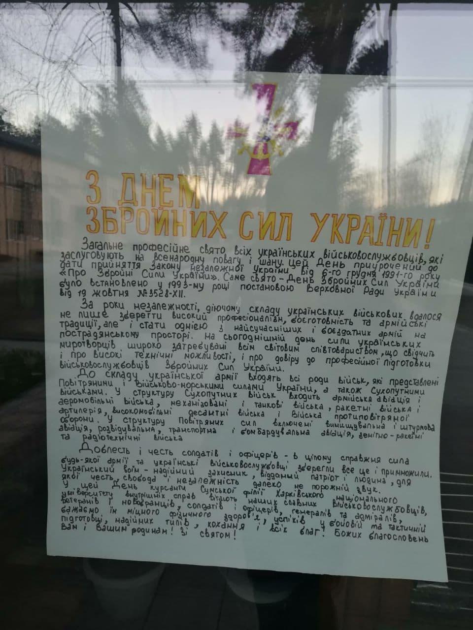 З нагоди відзначення Дня Збройних сил України для курсантів Сумської філії Харківського національного університету внутрішніх справ було проведено інформаційно-просвітницьку годину, редакційною групою випущено газету «Служимо Закону» та оформлено привітальну листівку.