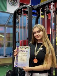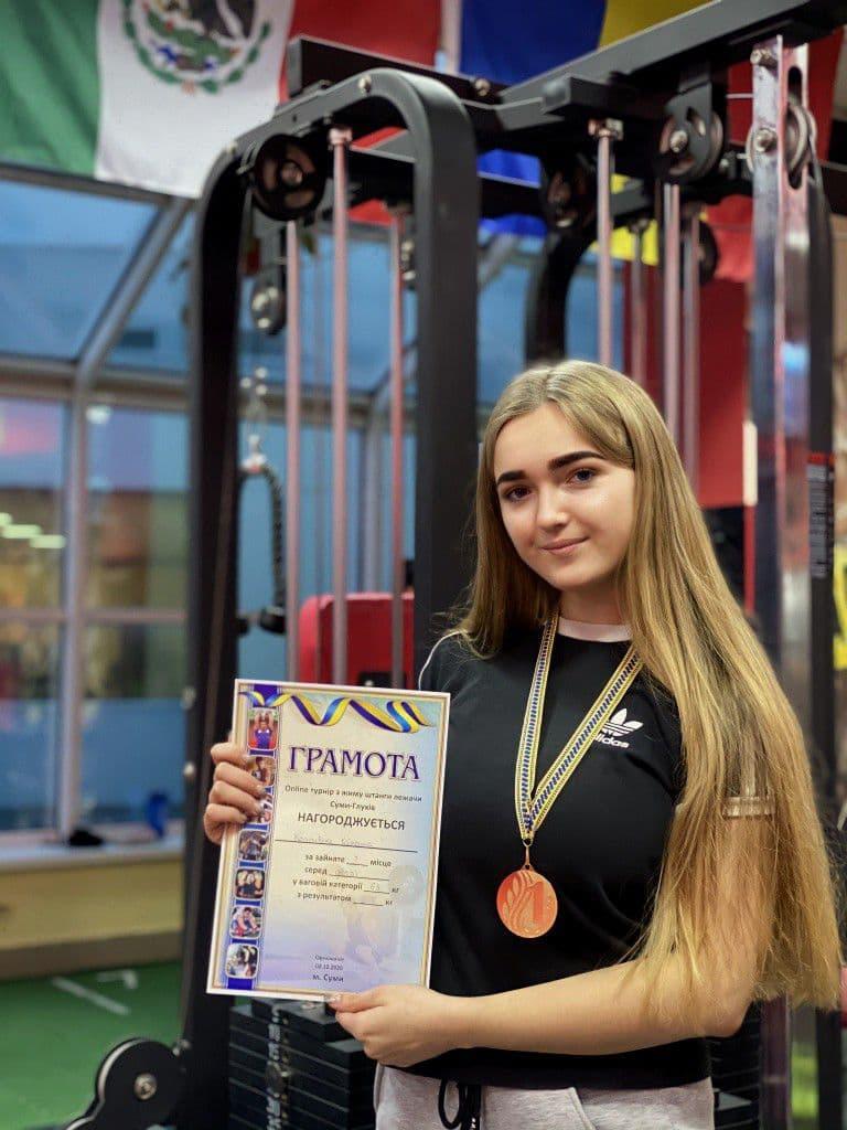 Завдяки своїй кропіткій роботі у спортивному напряму пауерліфтингу, щоденними тренуваннями рядовий поліції Катерина Крапивна виборола перше місце серед дівчат у категорії до 63 кг, за що нагороджена грамотою Федерації пауерліфтингу Сумської області та медаллю.