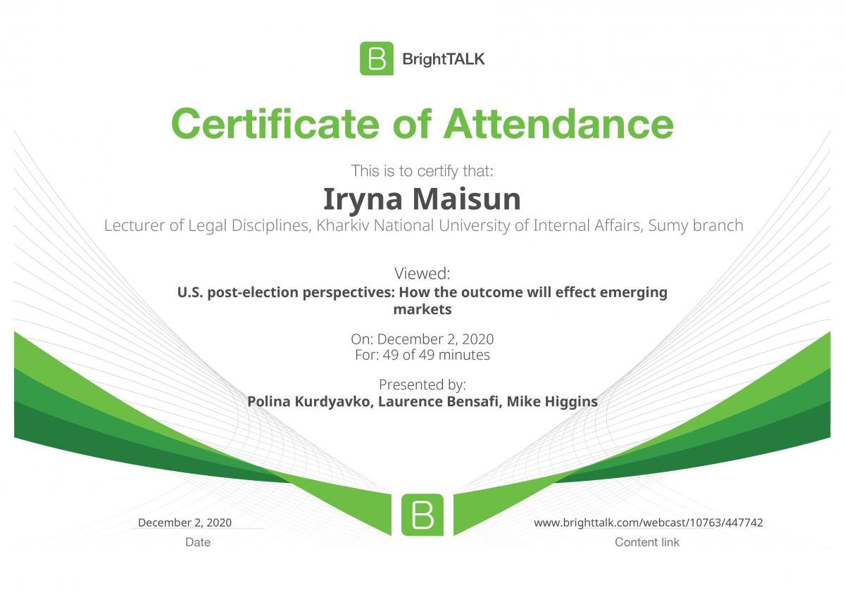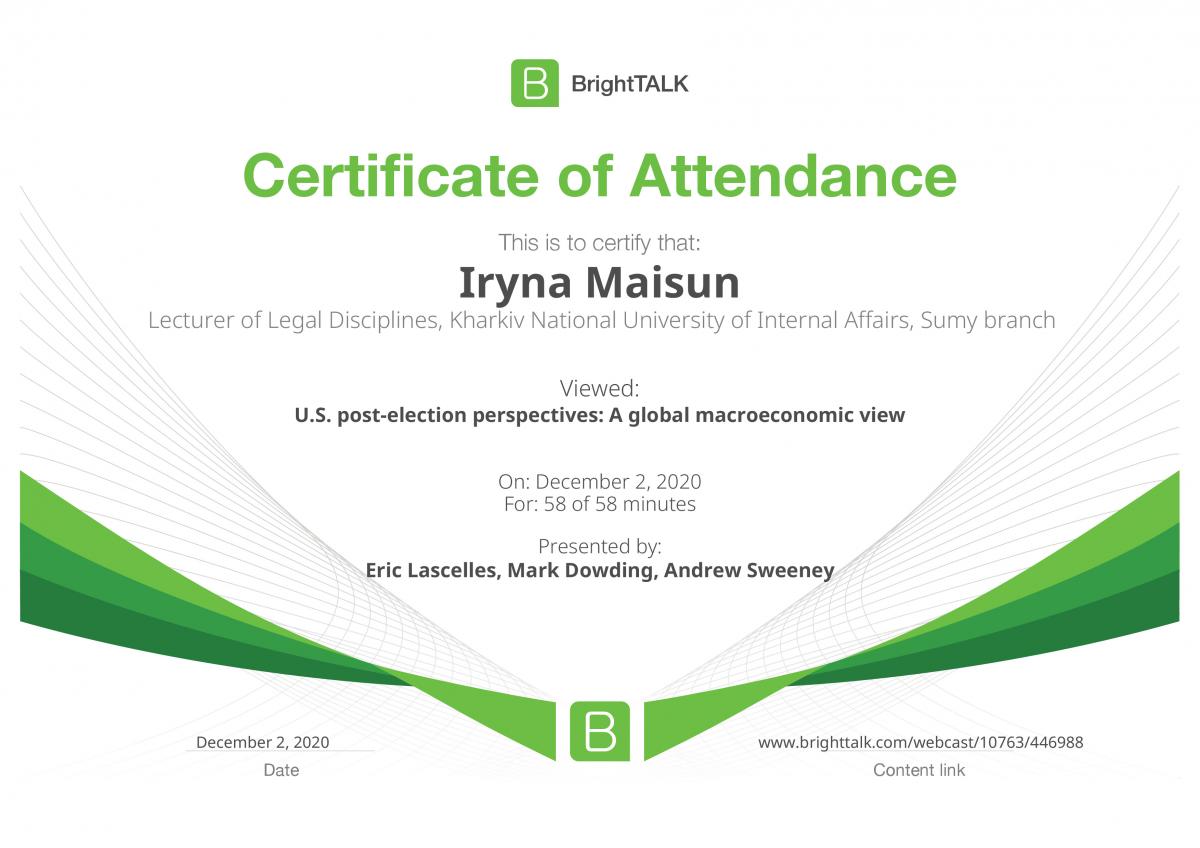 Викладач кафедри юридичних дисциплін Сумської філії ХНУВС Майсун Ірина прослухала цикл вебінарів на теми: