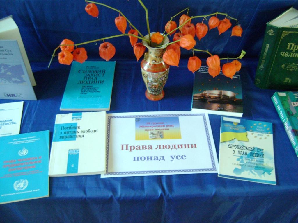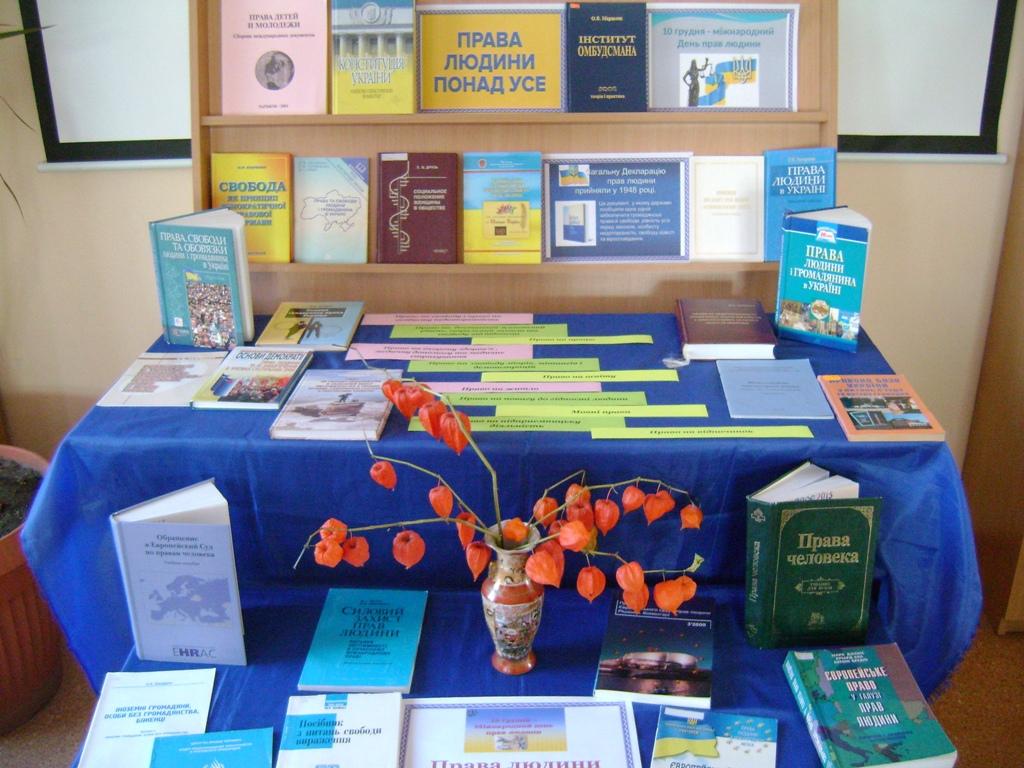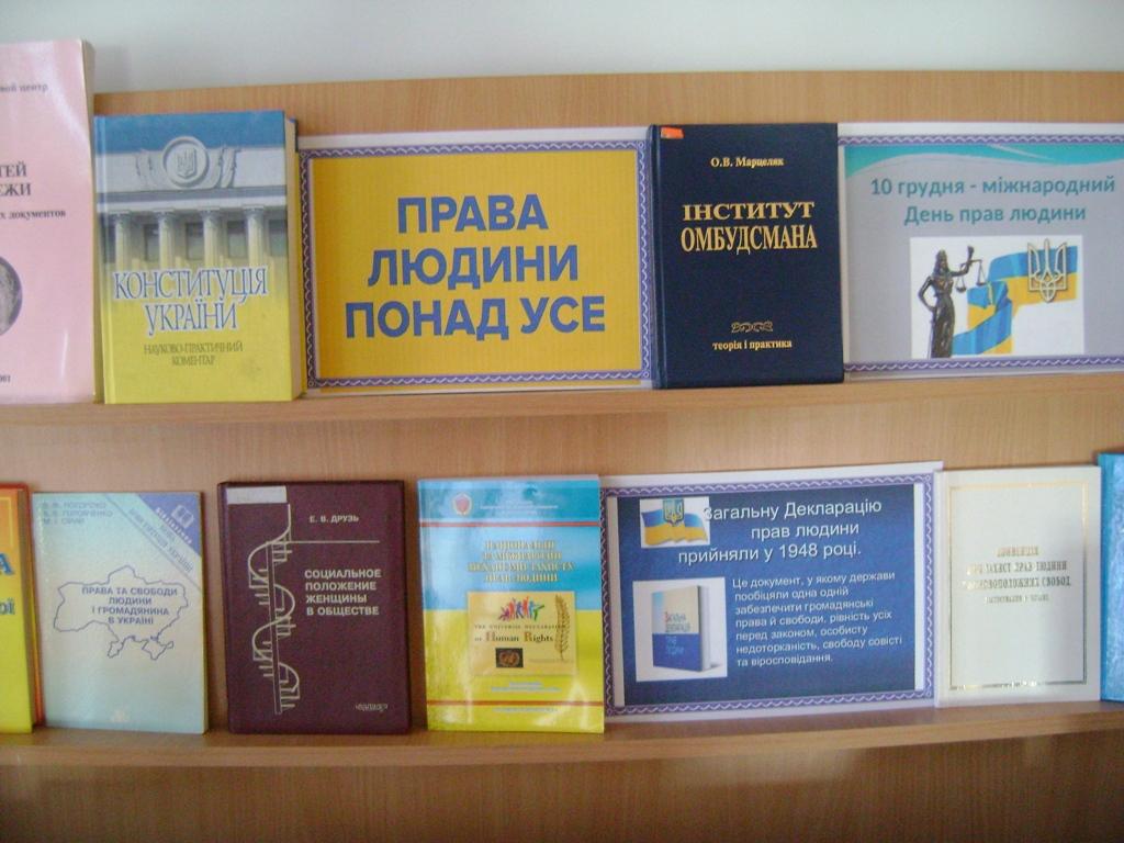В рамках святкування Дня прав людини, що відзначається щорічно 10 грудня відповідно до резолюції Генеральної Асамблеї ООН від 4 грудня 1950 року, запрошуємо переглянути книжкову виставку - міркування «ПРАВА ЛЮДИНИ ПОНАД УСЕ», яка експонується в читальній залі бібліотеки.