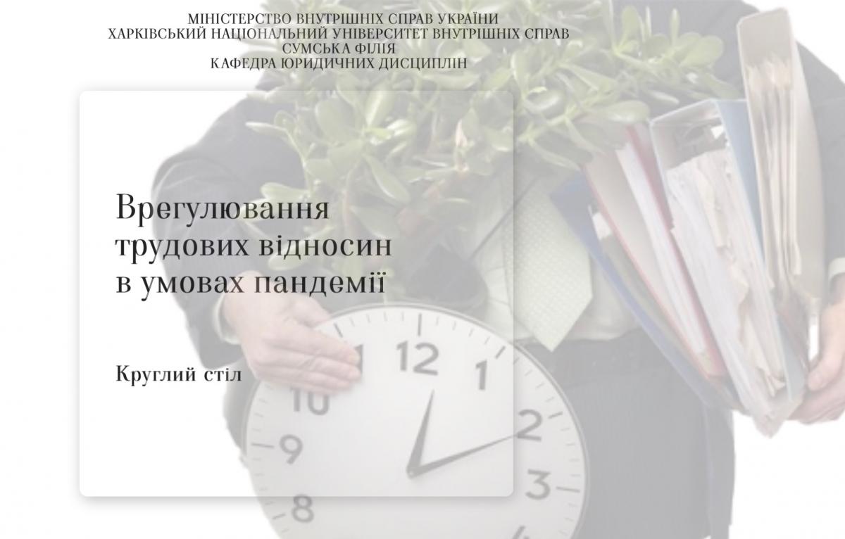 У Сумській філії Харківського національного університету внутрішніх справ пройшов онлайн круглий стіл «Врегулювання трудових правовідносин в умовах пандемії» в рамках тижня права, організатором якого стали завідувач кафедри юридичних дисциплін Оксана Панасюк та доцент кафедри юридичних дисциплін Наталія Дуравкіна.