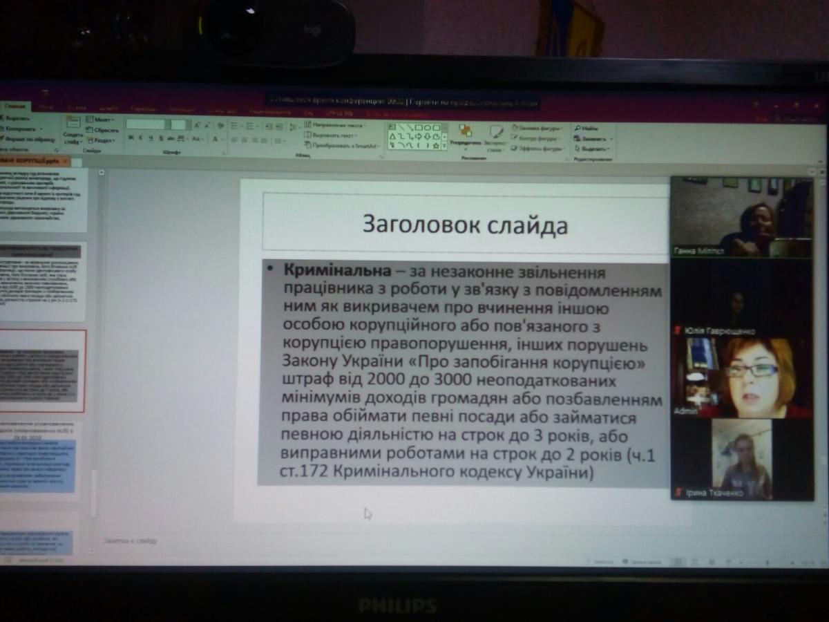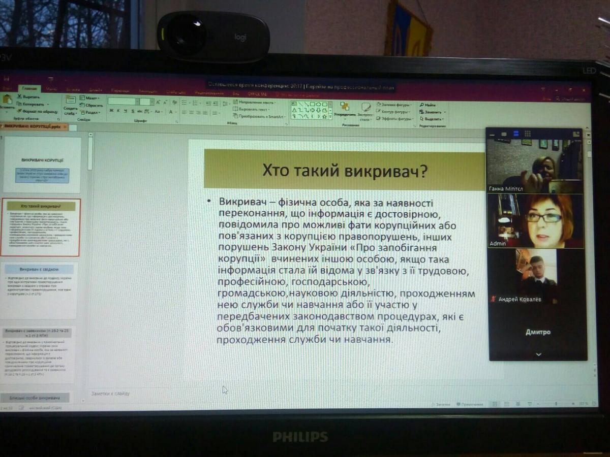 Під час лекції учасники мали можливість розглянути питання антикорупційного законодавства, проаналізувати основні причини, що являються корупційними ризиками та призводять до скоєння корупційних правопорушень, переглянути відео презентацію щодо подолання корупції викривачами.