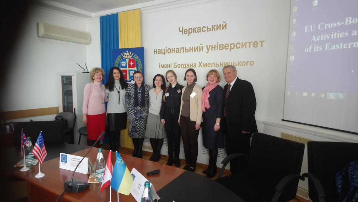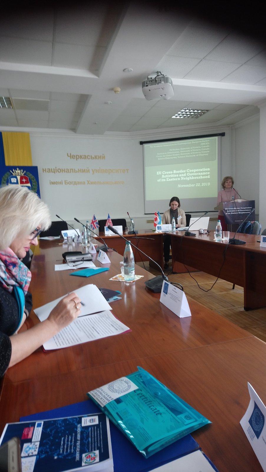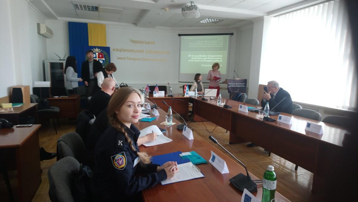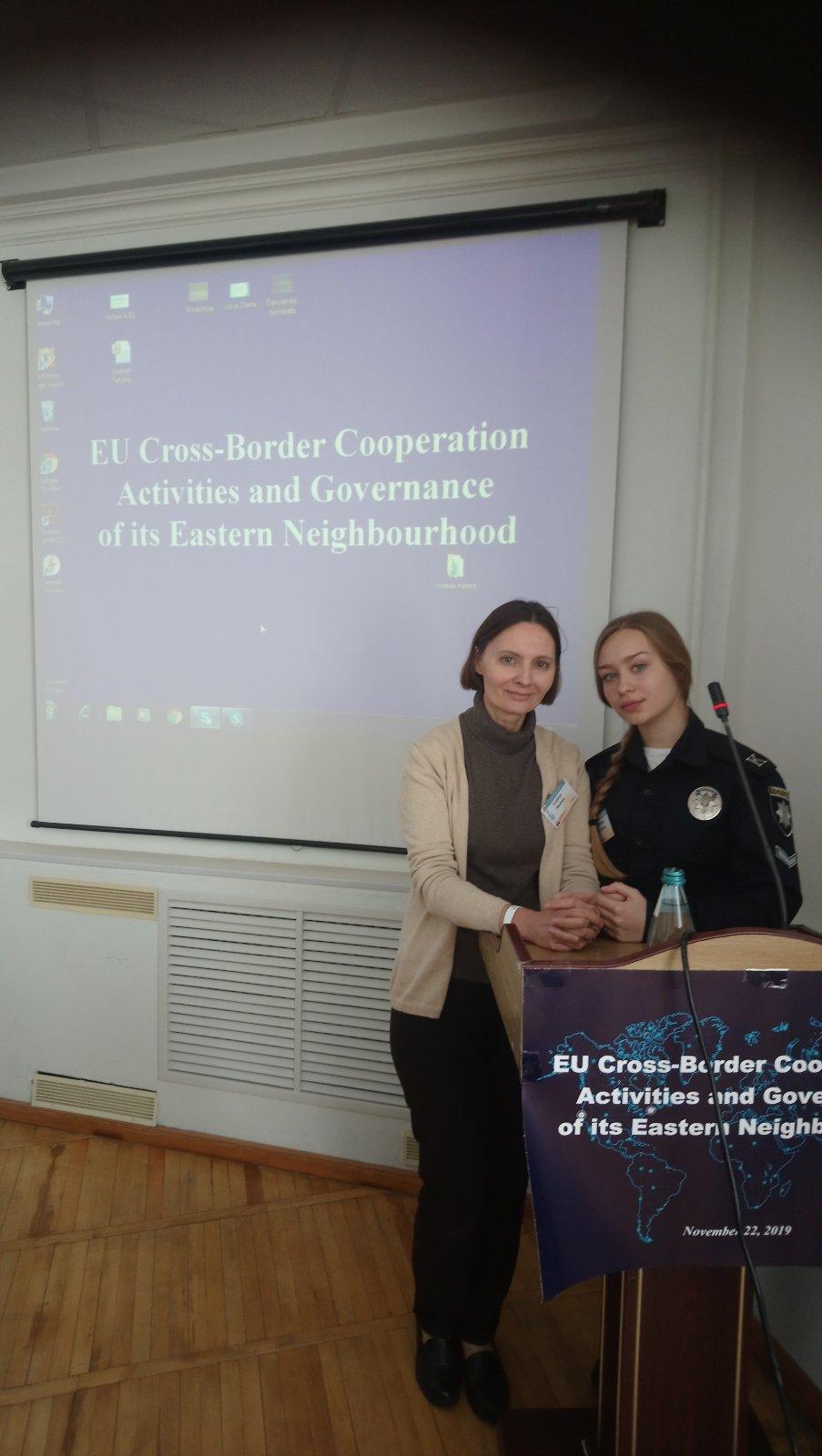 Професор кафедри юридичних дисциплін Сумської філії Харківського національного університету внутрішніх справ Наталія Горобець та курсантка 1 курсу Анастасія Даниленко взяли участь у міжнародному семінарі «EU Cross-Border Cooperation Activities and Governance of its Eastern Neighbourhood», що проводився Університетом Вікторія (Канада) разом із Черкаським національним університетом ім. Б. Хмельницького з доповіддю «Successes and failures that the united territorial communities in Sumy region encountered». Робоча мова заходу англійська. Захід присвячений добросусідським відносинам ЄС з країнами сусідами Східної Європи.