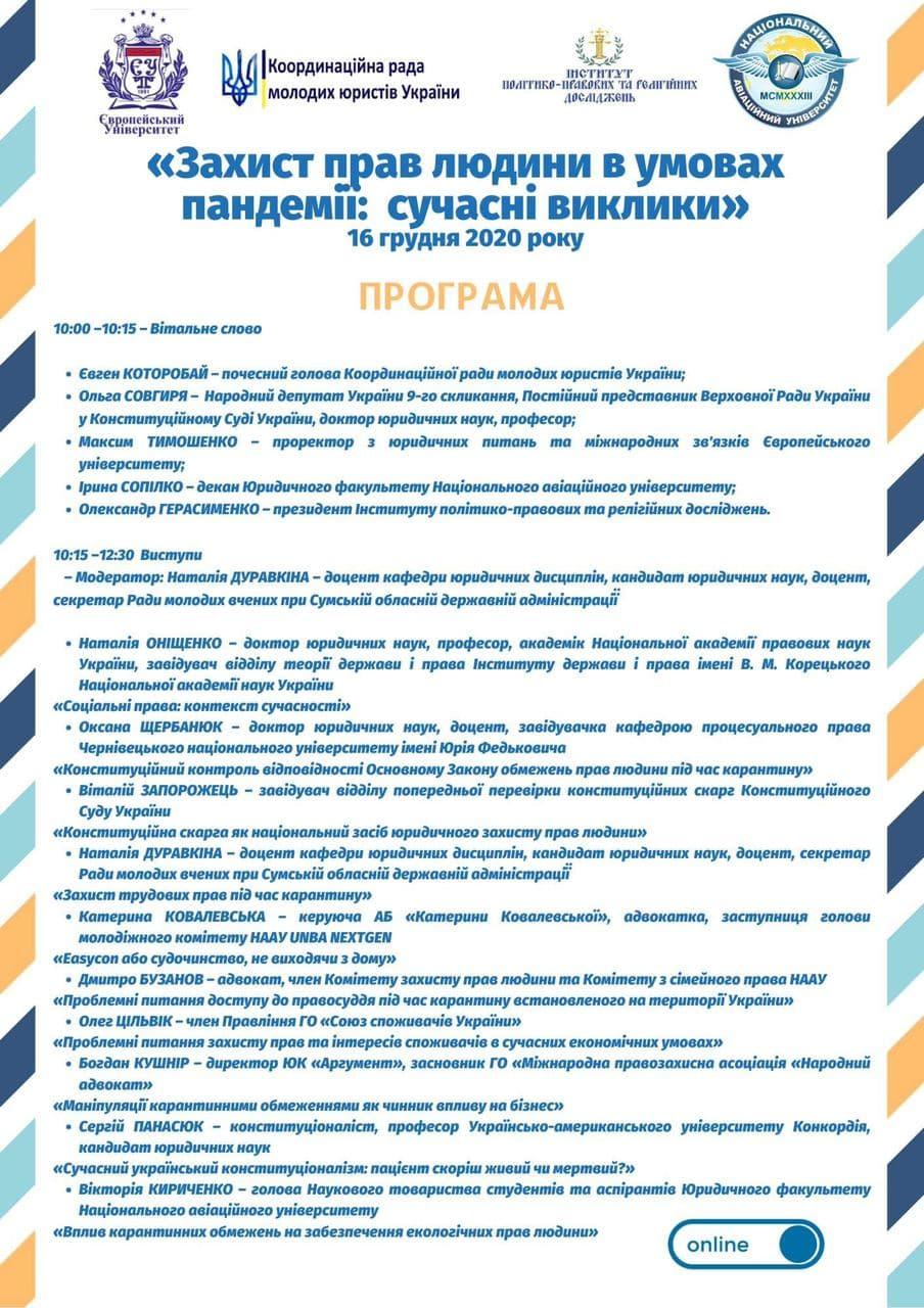 Наталія Дуравкіна, доцент кафедри юридичних дисциплін Сумської філії ХНУВС взяла участь у дискусійній панелі «ЗАХИСТ ПРАВ ЛЮДИНИ В УМОВАХ ПАНДЕМІЇ: СУЧАСНІ ВИКЛИКИ», що була організована Координаційною радою молодих юристів України, Європейським університетом та Інститутом політико-правових та релігійних досліджень з нагоди Міжнародного дня прав людини.