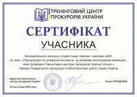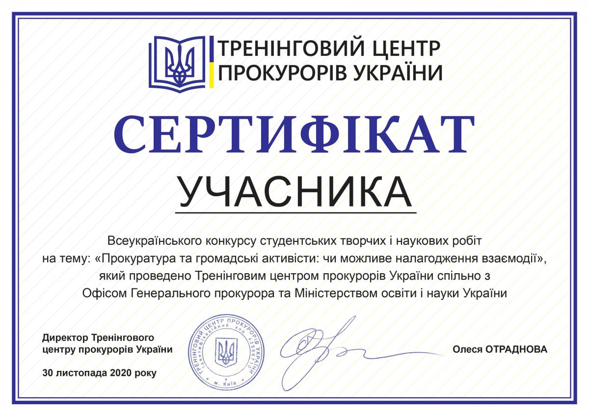Здобувачі вищої освіти першого (бакалаврського) рівня Право Коваленко Євгенія та Мартиненко Анна під керівництвом викладача кафедри юридичних дисциплін Цвітани Баранової та кандидата юридичних наук, доцента Олени Маркової взяли участь у Всеукраїнському конкурсі наукових робіт на тему «ПРОКУРАТУРА ТА ГРОМАДСЬКІ АКТИВІСТИ: ЧИ МОЖЛИВЕ НАЛАГОДЖЕННЯ ВЗАЄМОДІЇ». Конкурс проведено Тренінговим центром прокурорів України спільно з Офісом Генерального прокурора та Міністерством освіти і науки України.