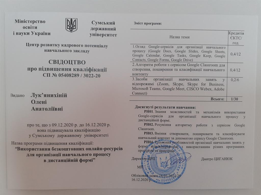Успішне опанування програми (обсягом 1 кредит) організатор навчання підтвердив видачею Олені Лук’янихіній свідоцтва про підвищення кваліфікації встановленого зразка.