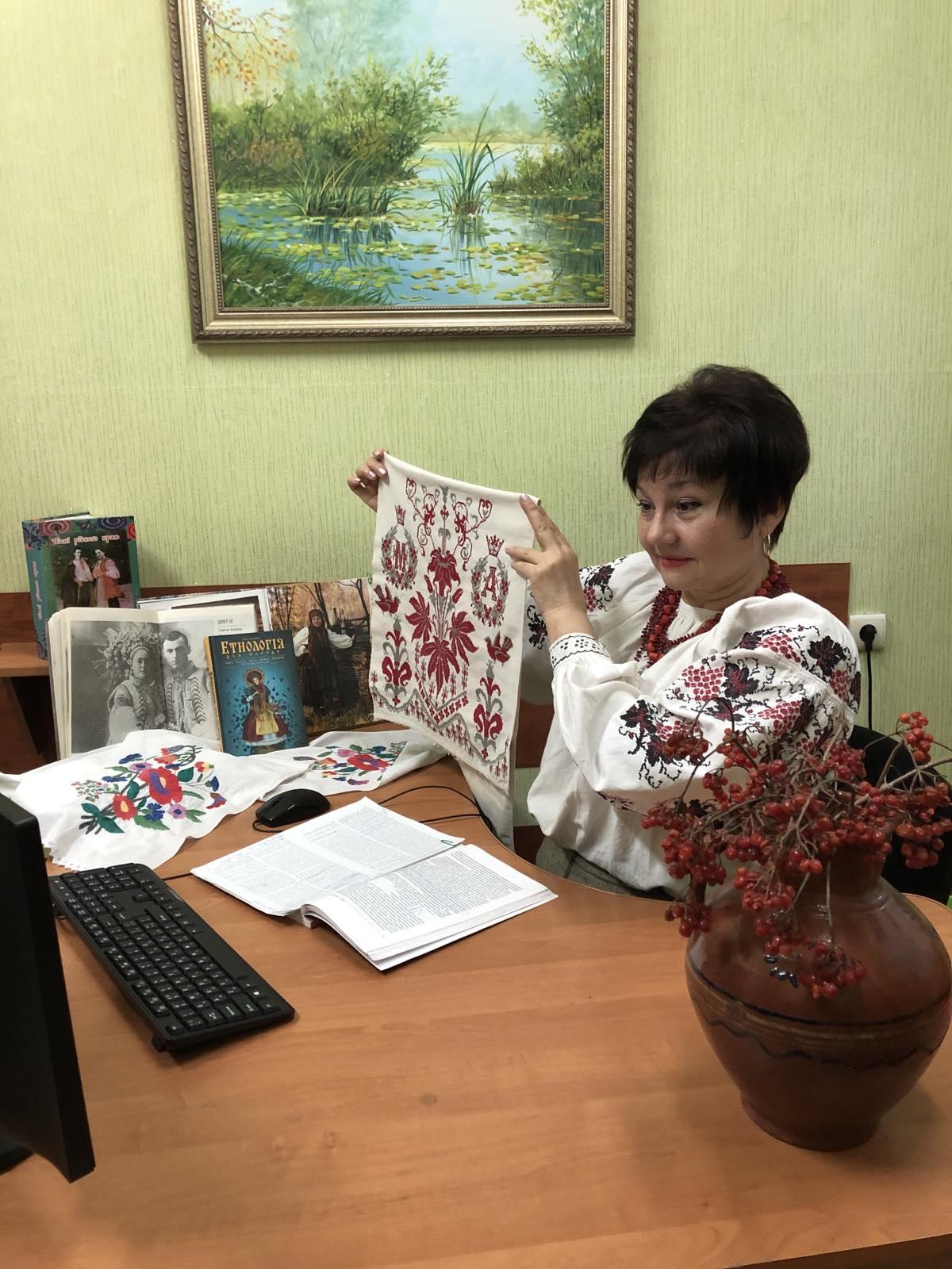 Надія Демиденко продемонструвала студентам старовинний весільний рушник середини ХIХ століття, подарований в «Українську світлицю» Сумської філії ХНУВС Людмилою Соловйовою. На ньому зображене символічне древо життя, яке є прообразом роду, продовженням життя. «Читаючи» символіку весільного рушника стає зрозумілим, що ліві гілки дерева означають родичів батьківського роду, праві – материнського. Зверху над віночками вишиті корони, що символізують вінчання молодят. У центрі віночків вишиті дві літери (одна з них означає першу літеру імені нареченої, інша - нареченого).