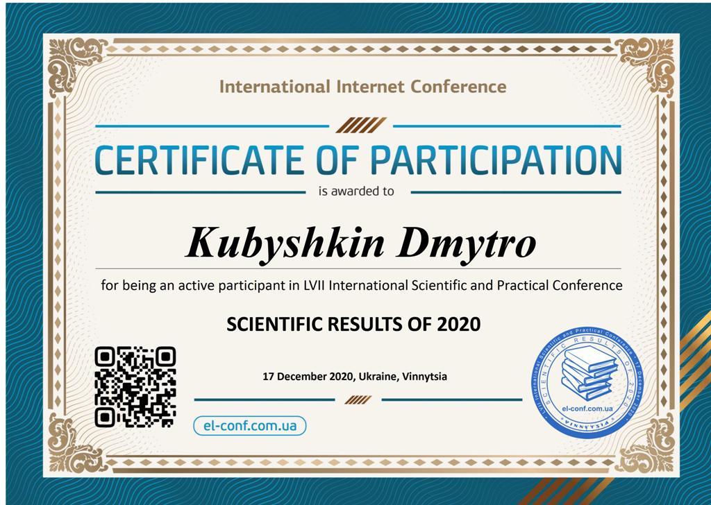 Здобувач вищої освіти другого (магістерського) рівня спеціальності «Право» Дмитро Кубишкін під керівництвом викладача кафедри гуманітарних дисциплін Олени Шкурат взяв участь у LVІI Міжнародній інтернет-конференції «Наукові підсумки 2020 року», що проводилась на базі Вінницького інституту економіки.