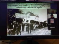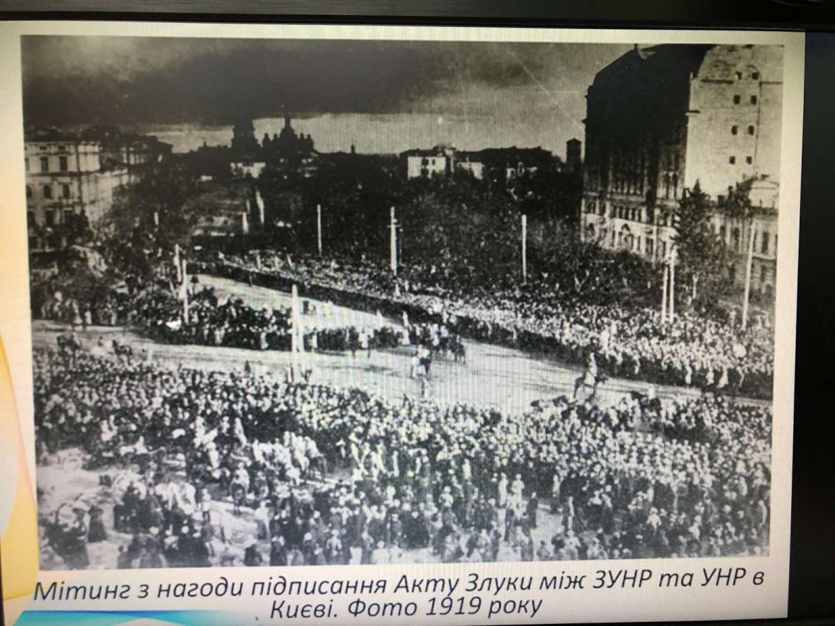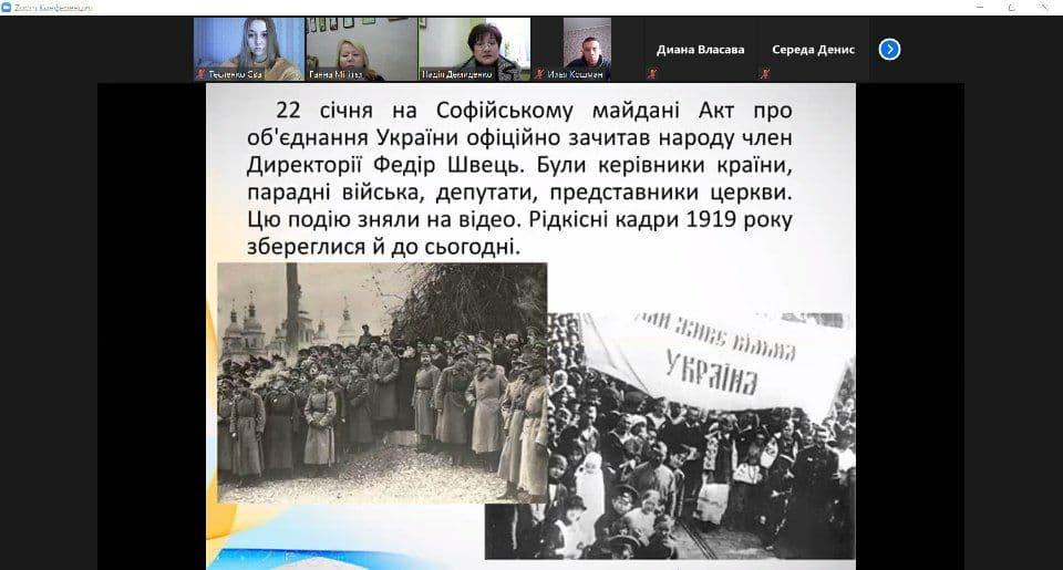 До уваги учасників заходу був запропонований перегляд відео-хроніки та світлин подій 22 січня 1919 року. З особливим пієтетом учасники заходу прослухали уривок із тексту «Універсалу Соборності», зачитаного на Софіївській площі членом Директорії, професором Київського університету Федором Швецем: «Однині на всіх землях України, розділених віками, - Галичині, Буковині, Закарпатській Русі і Наддніпрянській Україні – буде одна, велика Україна. Мрії, для яких найкращі сини України жили і вмирали, стали дійсністю. Однині повіки буде одна, самостійна Українська Народна Республіка». І хоч Київ вже через два тижні буде захоплений більшовиками, подія Злуки, як зазначали у своїх відгуках присутні на заході курсанти, має залишатись у генетичній пам’яті українців назавжди, як дороговказ у розбудові сучасної державності.