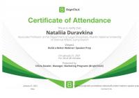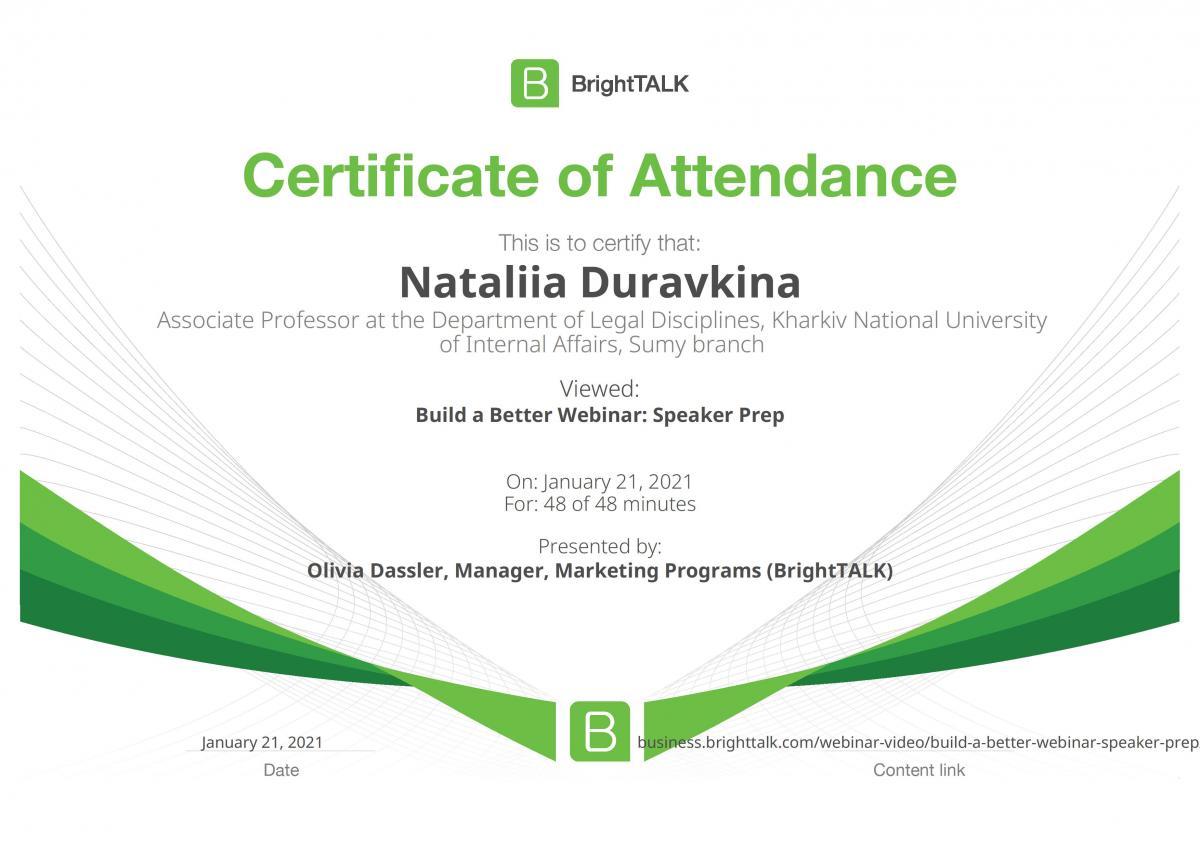 Доцент кафедри юридичних дисциплін Сумської філії Харківського національного університету внутрішніх справ Дуравкіна Наталія прослухала вебінар «Build a Better Webinar: Speaker Prep», який було проведено Олівією Дасслер, менеджером та маркетологом освітньої платформи BrightTALK.