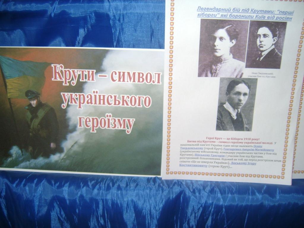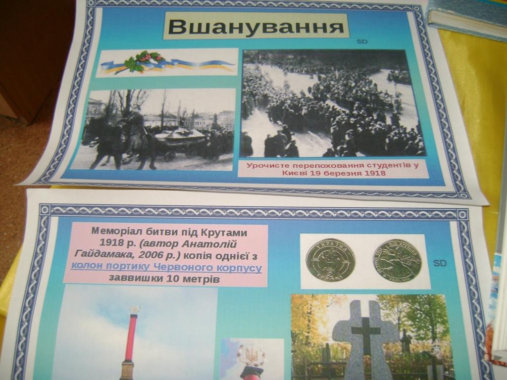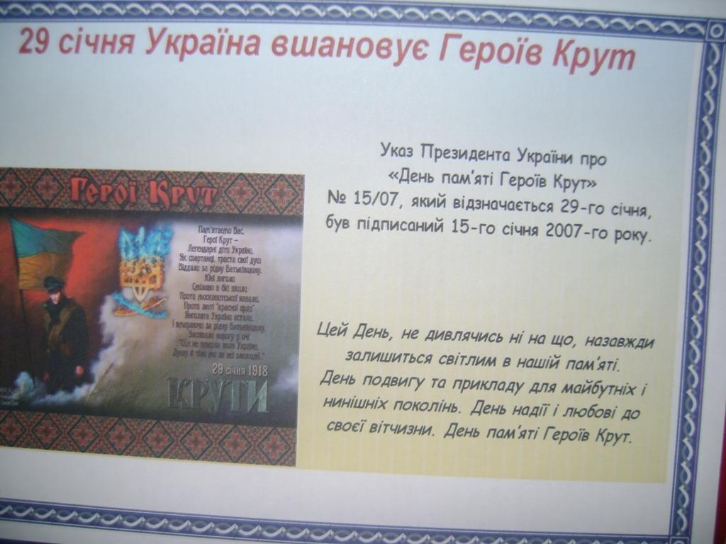 Цей День, не дивлячись ні на що, назавжди залишиться світлим в нашій пам’яті. День подвигу та прикладу для майбутніх і нинішніх поколінь. День надії і любові до своєї вітчизни. День пам’яті Героїв Крут.