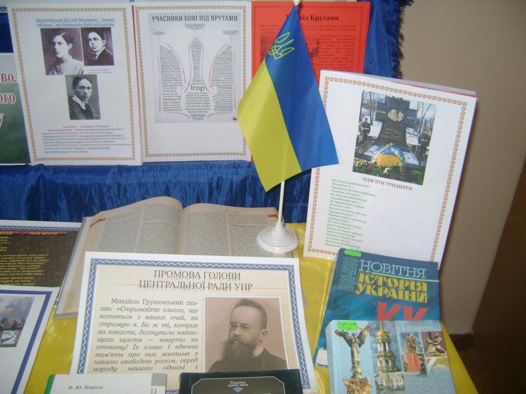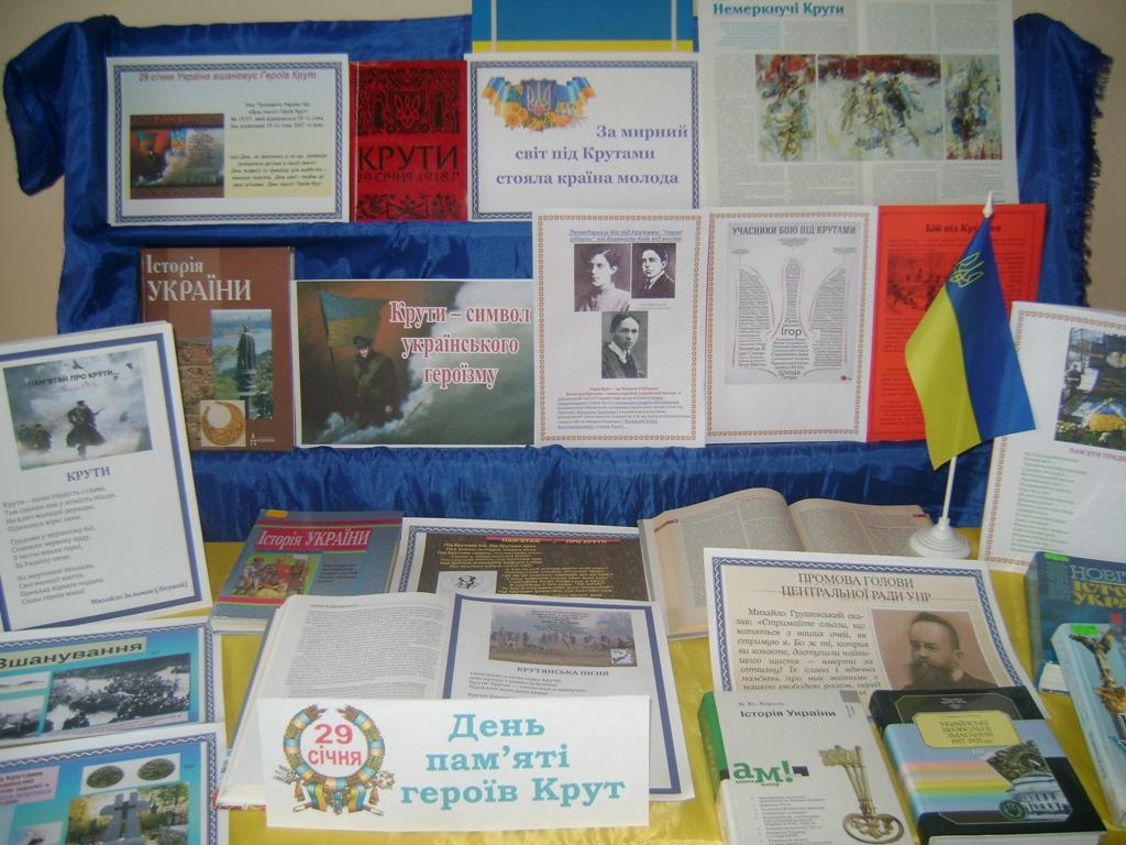 Напередодні відзначення дня пам'яті героїв Крут в бібліотеці філії оформили книжкову виставку - пам'ять «За мирний світ під Крутами стояла країна молода», де представлені книги, статті, поезії, присвячені цим подіям. Кожен бажаючий може ознайомитися з запропонованими виставочними матеріалами, що розкривають трагічні сторінки української історії.