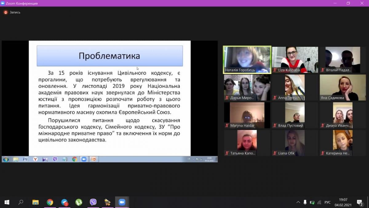Захід був присвячений першому засіданню у Верховній раді України Робочої групи з підготовки проекту Закону з рекодифікації (оновлення) цивільного законодавства України (28.01.21). У заході взяли участь 96 здобувачів вищої освіти. Учасники заходу обговорили зазначену подію, а також важливість оновлення цивільного законодавства на даному етапі розвитку України.