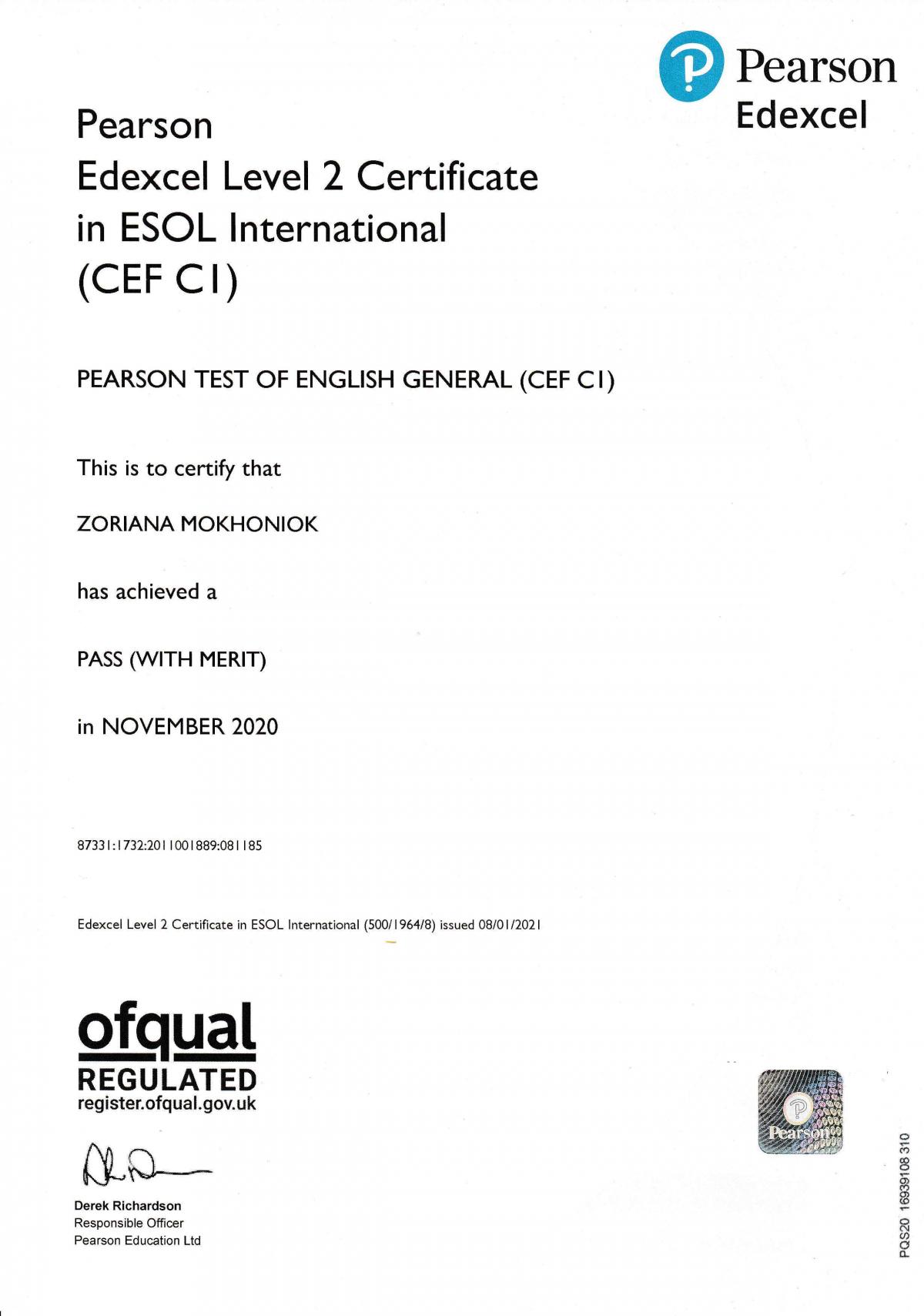 Pearson Tests of English – лінійка міжнародних екзаменів, орієнтованих на кандидатів, які не є носіями англійської мови. Тест оцінює наскільки добре аплікант розуміє носіїв мови і грамотно висловлює свої думки в усній і письмовій формі. У професійному спілкуванні повинен вміти висловлювати свої думки коректно, адекватно і стилістично грамотно, здатний спілкуватися без явних труднощів з підбором слів і виразів, а також підтримувати ефективне листування англійською.