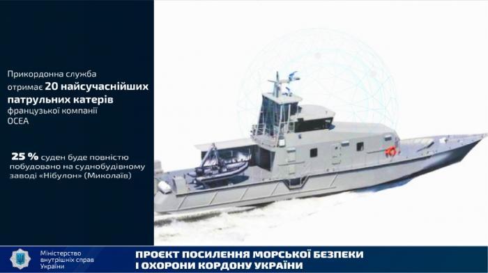 «Триває активна співпраця МВС з Французькою Республікою щодо посилення морської безпеки і охорони кордону України. Завдяки цьому проекту наша держава отримає сучасні катери та технології щодо їх подальшого виробництва. Французькими партнерами вже будуються два катери для прикордонників, їх поставка очікується в поточному році. Українські корабельники отримають досвід міжнародної кооперації та доступ до сучасних світових технологій виробництва швидкісних суден. До речі, локалізація 25 відсотків виробництва буде здійснена на суднобудівному заводі «Нібулон» у Миколаєві», - наголосив Арсен Аваков.