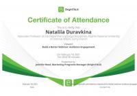 Наталія Дуравкіна, доцент кафедри юридичних дисциплін Сумської філії ХНУВС стала учасником вебінару «Build a better webinar: audience engagement», який було проведено Дженніфер Рід, менеджером маркетингових програм освітньої платформи «BrightTALK».