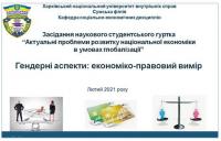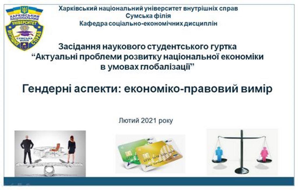 Дослідження економічних і правових аспектів виникнення, поширення гендерної нерівності, пошуку шляхів зменшення дискримінаційних процесів і явищ у різних сферах суспільних відносин є актуальною тематикою сьогодення. Планове засідання наукового гурта кафедри соціально-економічних дисциплін Сумської філії Харківського національного університету внутрішніх справ «Актуальні проблеми розвитку національної економіки в умовах глобалізації» теж було присвячене одному із аспектів цього явища.