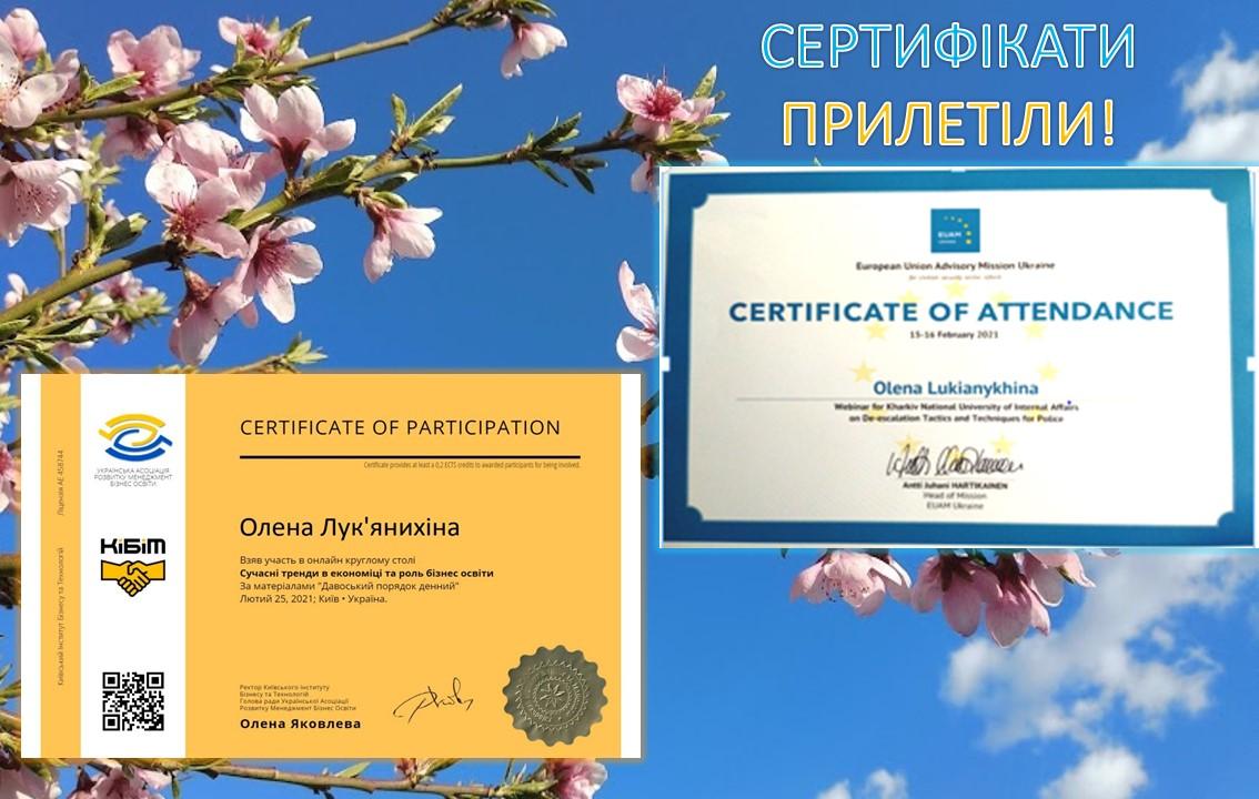 Початок весни завжди надихає: отримання сертифікатів про участь у заходах, спрямованих на підвищення професійного рівня науково-педагогічного працівника закладу вищої освіти, є підтвердженням актуальності обраного вектору руху у напрямку особистісного розвитку й удосконалення викладацьких компетентностей.
