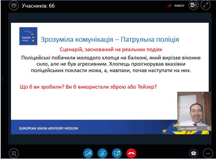 Спікер заходу радник з питань верховенства права Регіонального представництва КМЄС у Харкові Саєр Аммар на прикладі кейсів розглянув можливі і найефективніші способи розв’язання конфліктних ситуацій, що виникають під час виконання службових обов’язків у працівників поліції. Учасники вебінару теж долучалися до обговорення методів реагування на ситуації, розглянуті у представлених завданнях, і пропонували власні способи вирішення конфліктної ситуації.