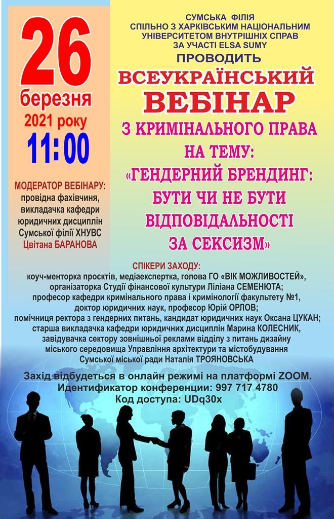 26 березня 2021 року об 11:00 Сумська філія спільно з Харківським національним університетом внутрішніх справ за участі ELSA Sumy проводить Всеукраїнський вебінар з кримінального права на тему «Гендерний брендинг: бути чи не бути відповідальності за сексизм».