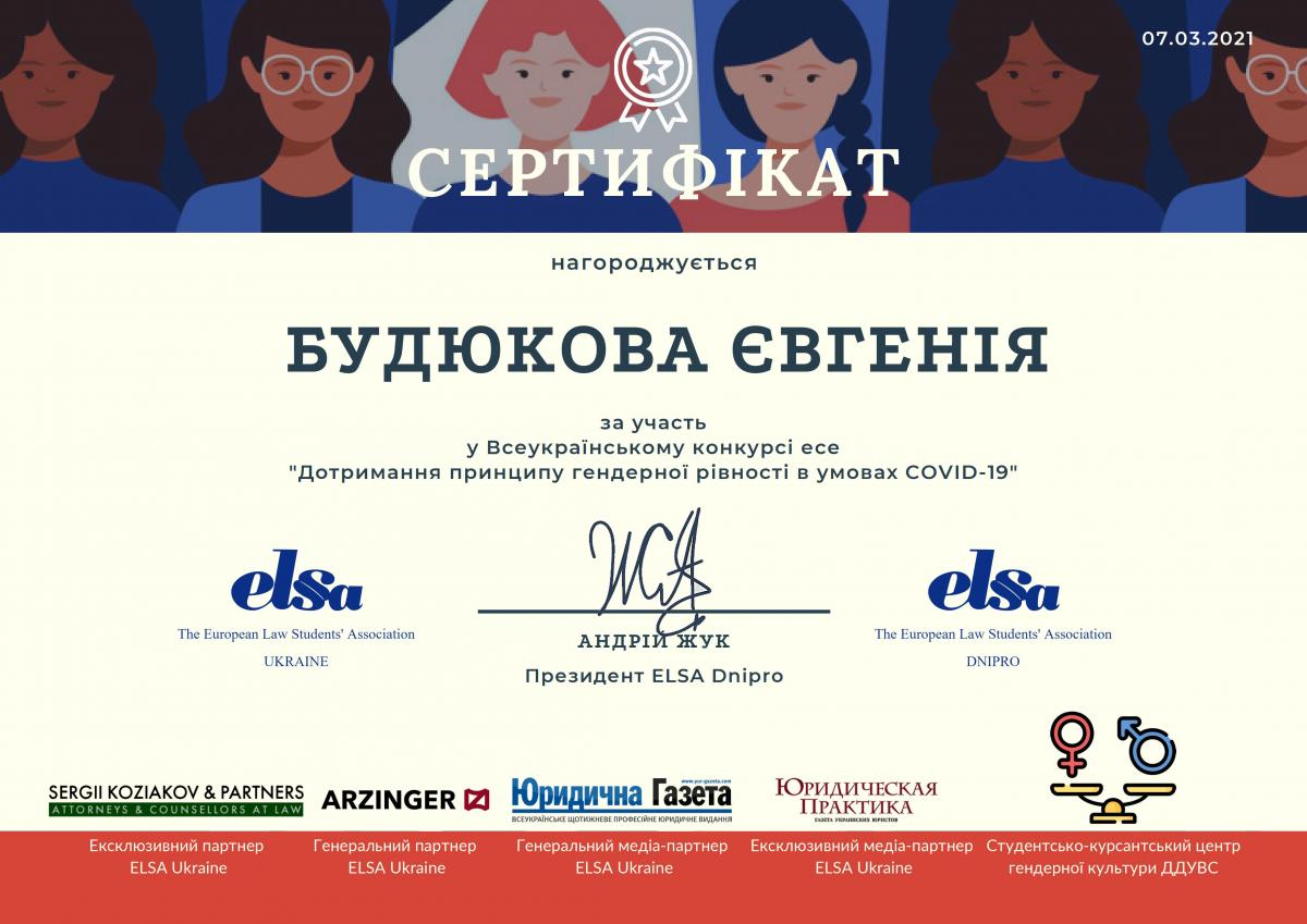 Здобувачка вищої освіти Сумської філії Харківського національного університету внутрішніх справ спеціальності 081 Право Євгенія Будюкова під керівництвом викладачки кафедри юридичних дисциплін Цвітани Сергіївни Баранової отримала сертифікат за участь у Всеукраїнському конкурсі есе «Дотримання принципу гендерної рівності в умовах COVID-19», організованого ELSA Dnipro.
