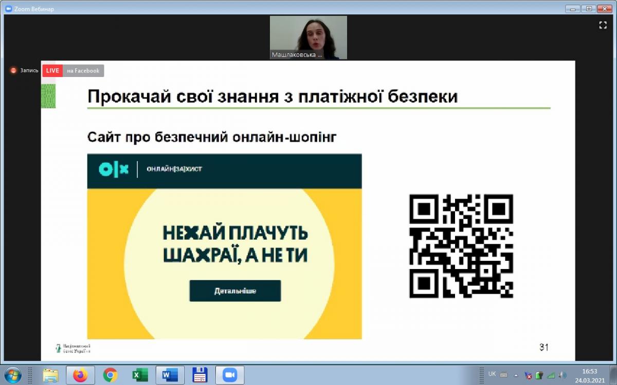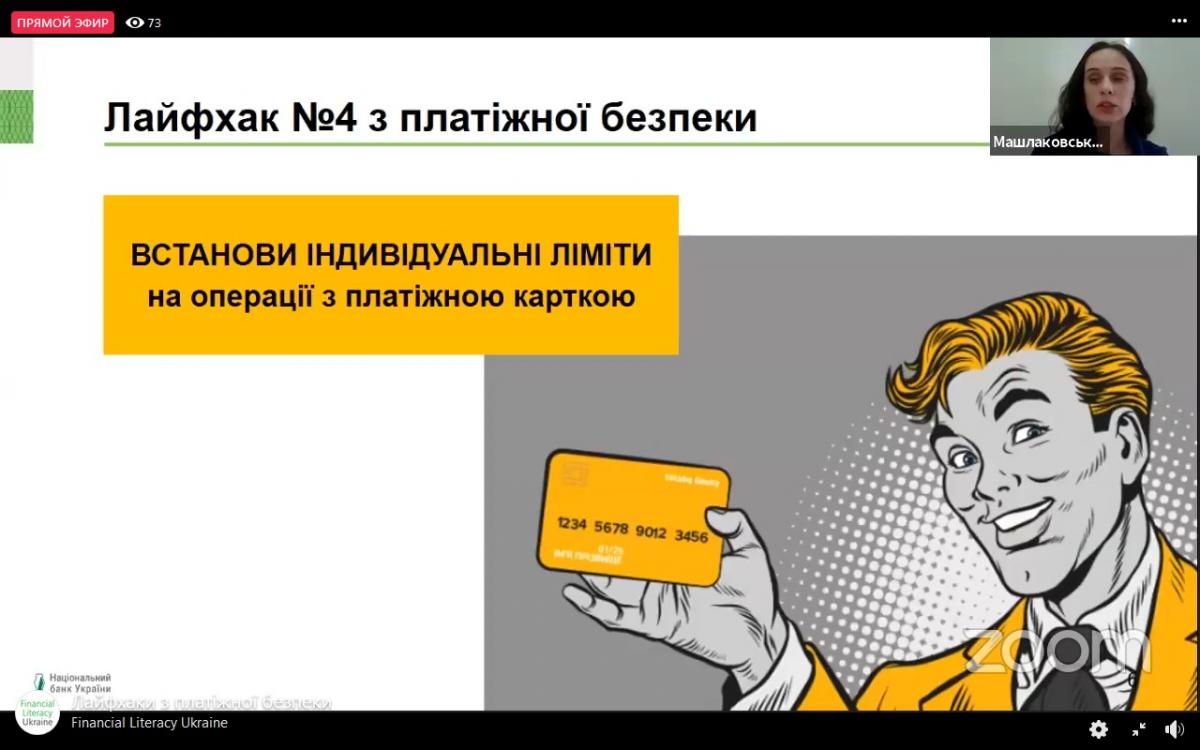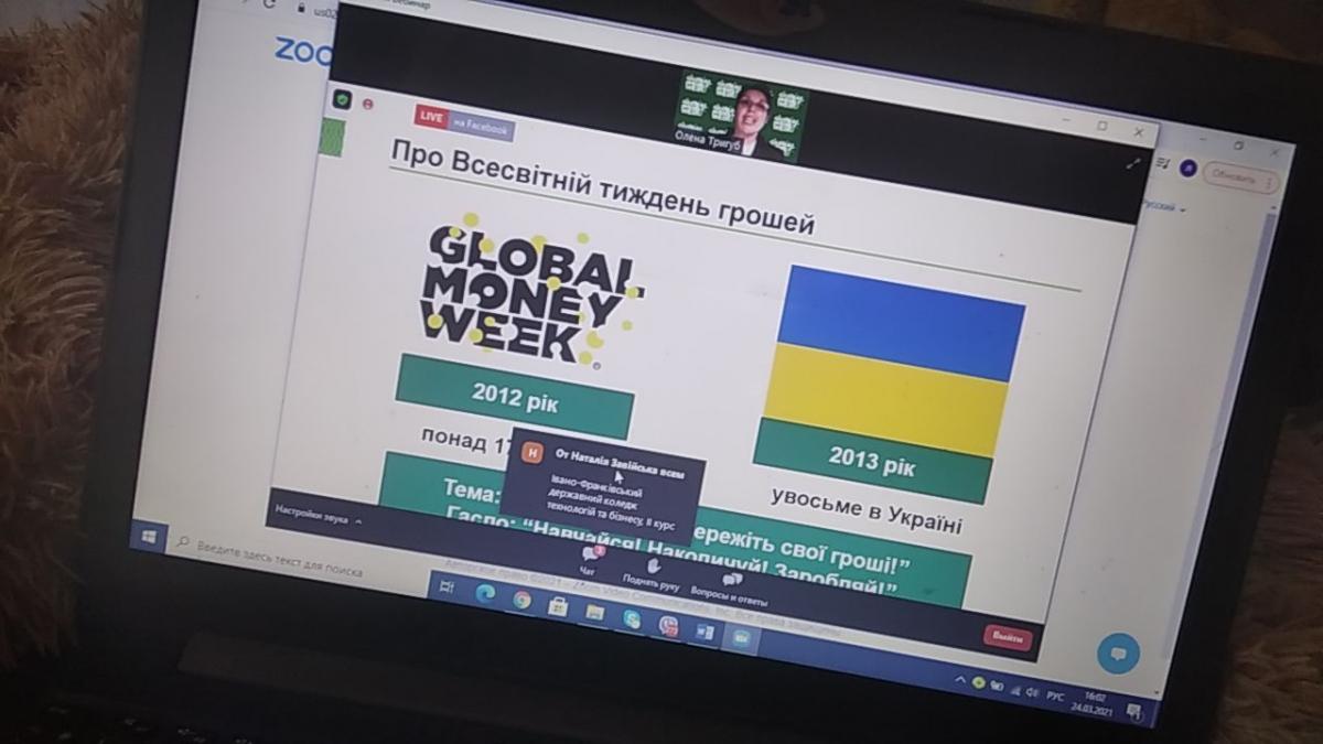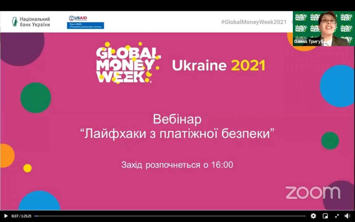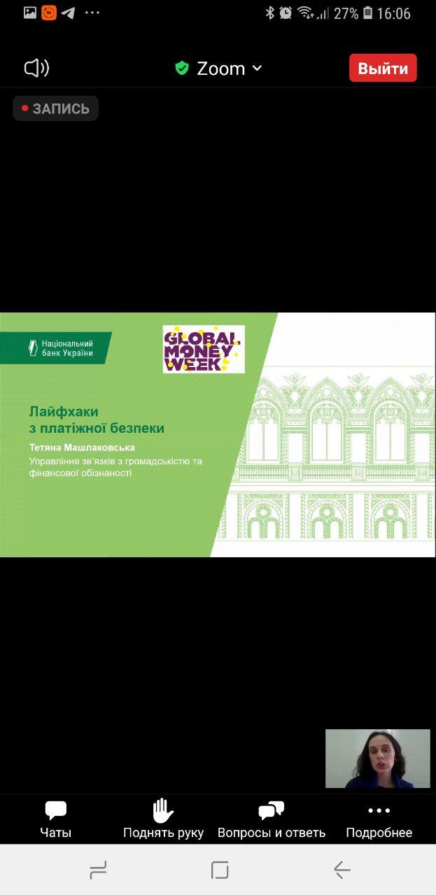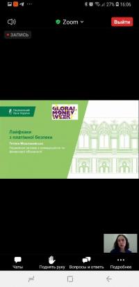 З огляду на це, старший викладач кафедри соціально-економічних дисциплін Сумської філії Харківського національного університету внутрішніх справ Світлана Петровська та студенти 3 курсу у рамках вивчення дисципліни «Фінанси» прийняли участь у вебінарі «Лайфхаки з платіжної безпеки», що відбувся у рамках святкування в Україні Всесвітнього тижня грошей (Global Money Week). Спікером вебінару виступила Тетяна Машлаковська, Управління зв’язків з громадськістю та фінансової обізнаності, Національний банк України.