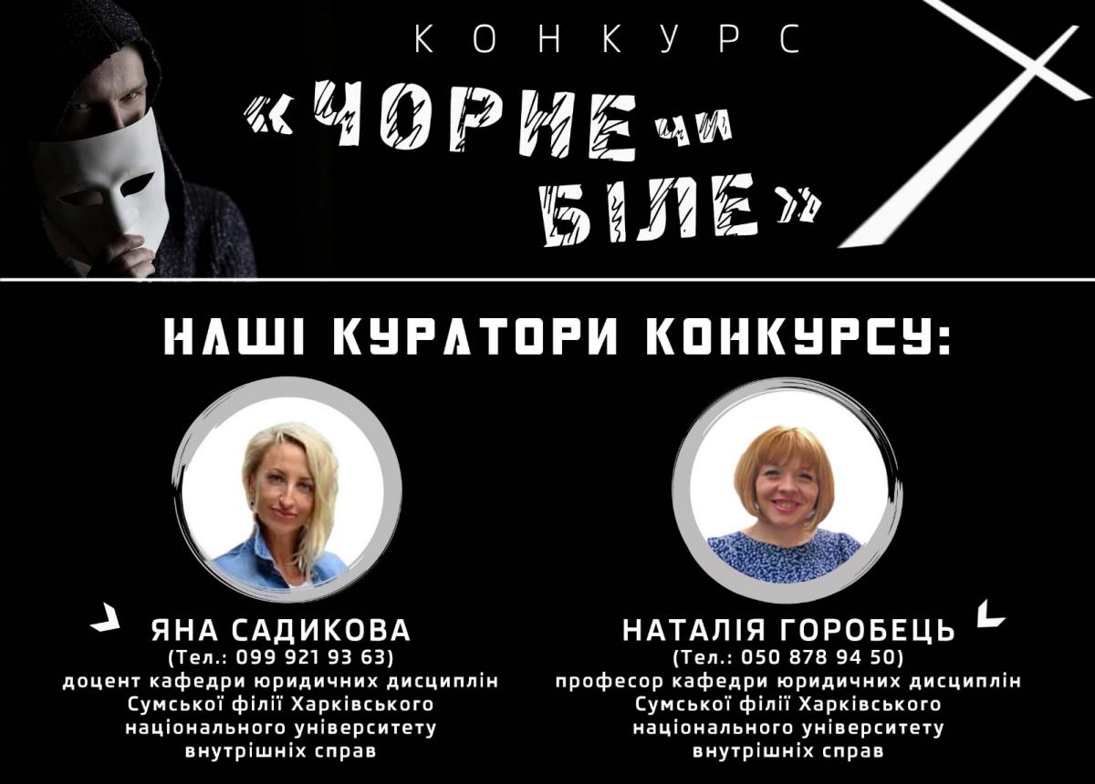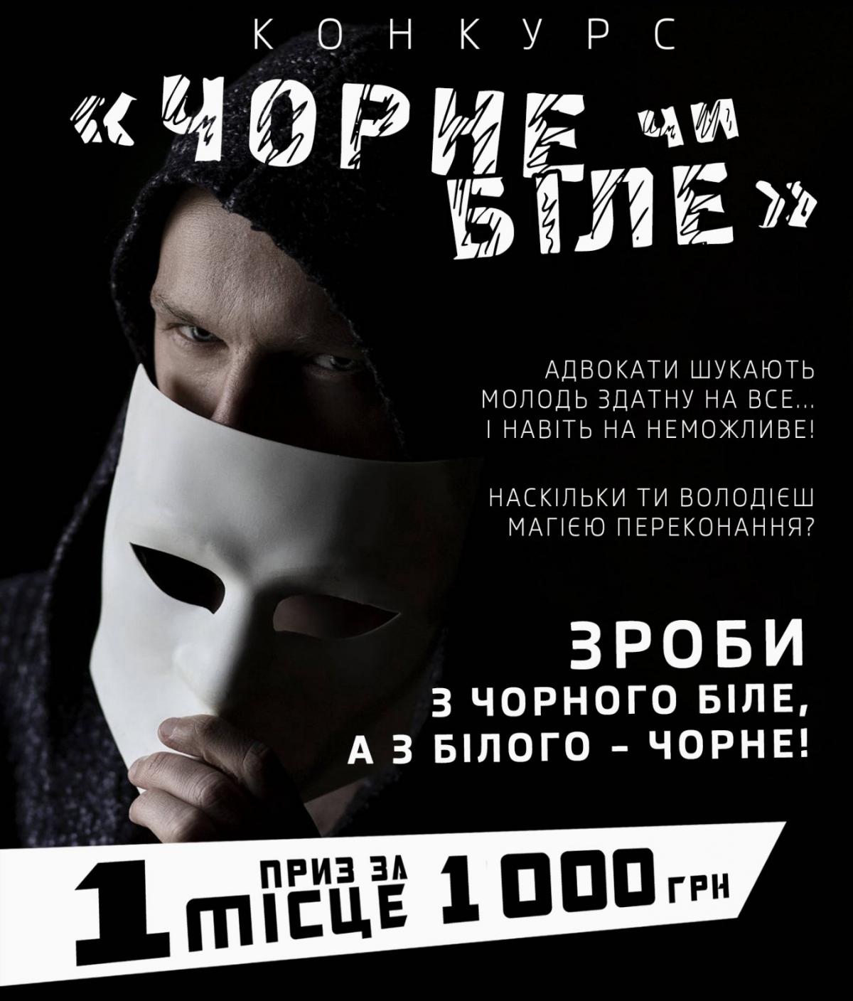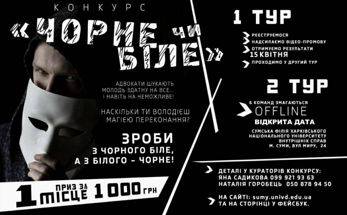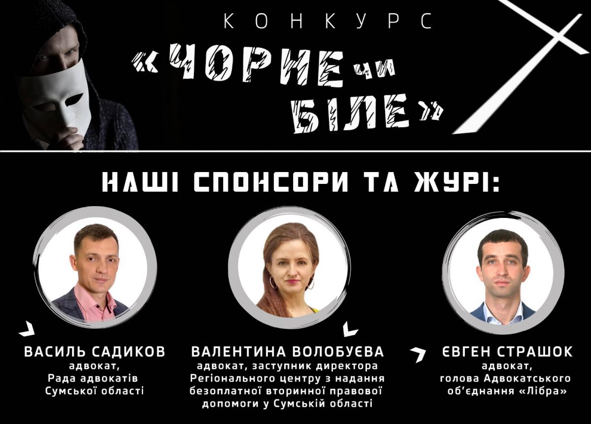 Адвокати Ради адвокатів Сумської області та Сумська філія Харківського національного університету внутрішніх справ оголошують конкурс «Чорне чи біле»! Ми сподіваємося, що Вам сподобається наша ідея і Ви спробуєте себе у непростій справі!